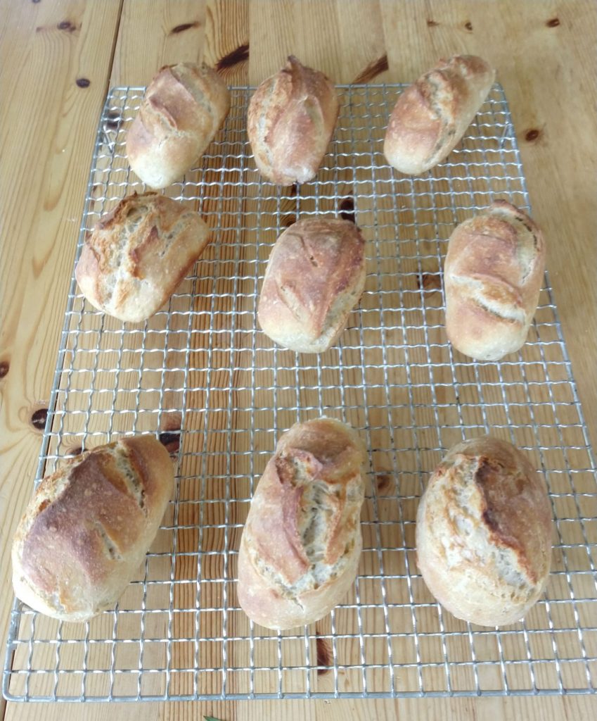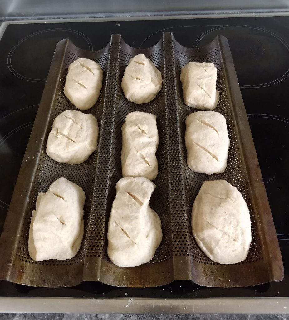 Für Baguettes aus dem Teig 3 Stränge formen (ziehen und drehen). Für Brötchen diese Stränge in jeweils 3 Teile unterteilen. Baguettes und Brötchen bekommen eine schöne Form, wenn sie auf einem Baguetteblech gebacken werden. Das Backblech einmehlen. Danach nochmals alles 20 Minuten ruhen lassen. Die Brötchen 18 Minuten goldbraun backen. Zu Beginn die Brötchen mit Wasser besprühen.