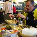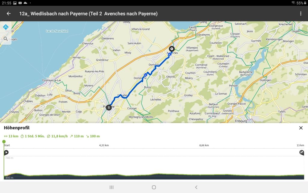 Auffällig auf der ganzen Strecke war, daß es keine Bänke für eine wohlverdiente Pause gab. Nach 2,5 Stunden Fahrzeit kehrten wir im Örtchen Rue direkt unter der Burganlage ein. Dort konnten wir uns mit einem leckeren Salat stärken und für die nächsten heftigen Anstiege erholen. Auf der nächsten Strecke mußten wir aus unseren Akkus kurzzeitig sogar au die 3. Stufe Sport schalten, um die Steigung zu bewältigen. Der höchste Punkt des Tages war heute 850 m. Danach ging es nach Romont weitgehend nur noch abwärts. Kurz vor Ladenschluß um 16:00 Uhr erreichten wir einen Coop, wo wir uns mit Essen versorgten. Danach begann eine 4 KM lange Irrfahrt durch den Ort, bis wir unser Hotel, das etwas außerhalb lag, erreichten.