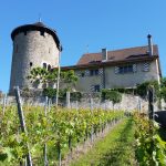 In Lausanne startete die eigentliche Herzroute. Wir folgten der gut markierten Veloroute 99 für einige Kilometer der Straße entlang auf Seehöhe. Von unser Radtour 2012 entlang der Rhone wussten wir aber, daß das ein kurzes Erlebnis ist. Schon bald ging es in die Weinberge. Morgens war der Autoverkehr im Weinberg noch überschaubar. Der Blick über den See auf die walliser und französischen Alpen war unbezahlbar. Am liebsten hätten wir dauernd Fotostopps gemacht, wussten aber, daß kein Foto diese gewaltigen Eindrücke einfangen kann.