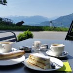 Etwas später ging es richtig zur Sache, d.h. gut bergauf. Wir konnten das mit Hilfe der Sportstufe gut bewältigen. Schließlich erreichten wir das Bütschelegg., wo wir unsere Beine und Akkus wieder aufladen konnten. Wir erwarteten hier die im Buch über die Herzroute angegebene Ladestation als Ladesäule mit mehreren Steckdosen. Dem war nicht so, es war eine Steckdose zum Aufladen, die per Kabel auf einer Mauer lag. In dem Restaurant konnten wir nicht nur unseren Durst löschen, sondern auch noch leckere Erdbeertörtchen essen. Faszinierend in der Wirtschaft war deren Personal. Alle waren stark pigmentiert, stammten offensichtlich aus Indien, Sri Lanka etc und sprachen perfektes Schwyzer Deutsch.