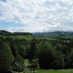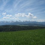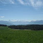 Endlich konnten wir bei relativ angenehmen Temperaturen und Sonnenschein starten. Es ging weiter auf der Veloroute 44. Der Einstieg in die Tagestour war heute schnell gefunden. Die Strecke war sehr schön. Erst ging es ziemlich eben voran. Später stieg es sanft an und die nächsten 90 Minuten mußten wir bedeutend mehr aus unseren Beinen und Akkus heraus holen. Dann wurden wir aber mit einer traumhaften Alpensicht belohnt. Nun träumten wir von einer schönen Bank im Schatten, um unsere Picknick zu genießen. Wie man auf dem Bild sehen kann, klappte es mit dem Schatten nicht ganz so. Dafür hatten wir auf einem leeren Schulhof einen Tisch und Bänke.Torsten und Lucys Almkäse und unser selbst gebackenes Roggenbrot waren eine wahre Delikatesse.