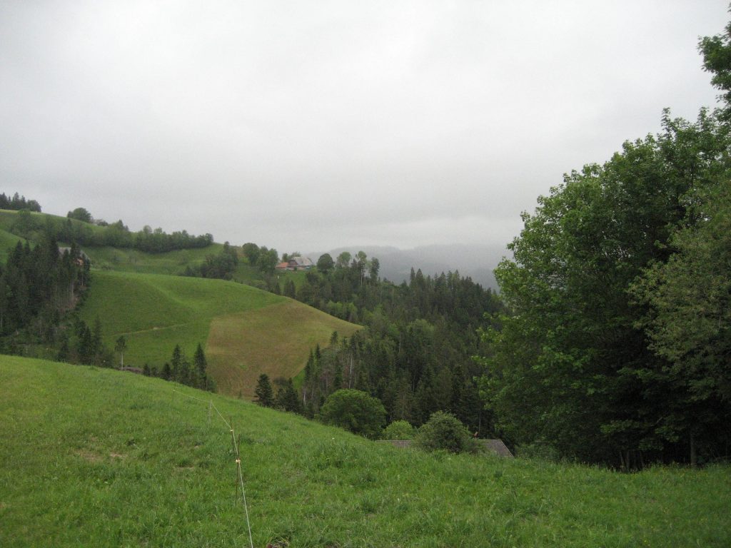 Der Blick am Morgen aus dem Fenster war ziemlich trostlos – Nebel. Die Temperaturen fühlten sich auch nicht gerade sommerlich an. wir hatten somit die Möglichkeit weiter Kleidungstücke aus unserem Gepäck zu testen. Wir fuhren los, gerade so warm, daß wir nicht auf dem Rad fest froren. Bald ließen wir den schönen beschaulichen Radweg an der Emme hinter uns und es ging bergauf. Nach 10 KM hatte der Akkus bereits seinen ersten Balken eingebüßt, nach 22 KM den zweiten. Wir fuhren an einigen Panoramatafeln vorbei, die erahnen ließen, daß man auf der Strecke eine tolle Fernsicht haben könnte. Der Nebel löste sich leider aber erst gegen Mittag auf. Offensichtlich ist das Gebiet auch ein beliebtes Wandergebiet. Es gab auch viele schön gelegene Bänke, die bisher Mangelware waren. Aufgrund des Nebels konnten wir das alles nicht so genießen.