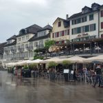 Der anfängliche Sonnenschein, der uns in Einsiedeln noch hoffen ließ, war schon längst einem grauen Himmel gewichen. Alls war grau, der Himmel, der See und die Berge. als wir dann in die Wolken abtauchten, war es auch noch naß. In Einsiedeln angekommen, hatten wir Glück, daß wir unser Hotelzimmer gleich beziehen konnten. Wir machten zwei Spaziergänge durch das nette Städtchen und träumten davon, wie schön es bei Sonnenschein hier sein müßte.