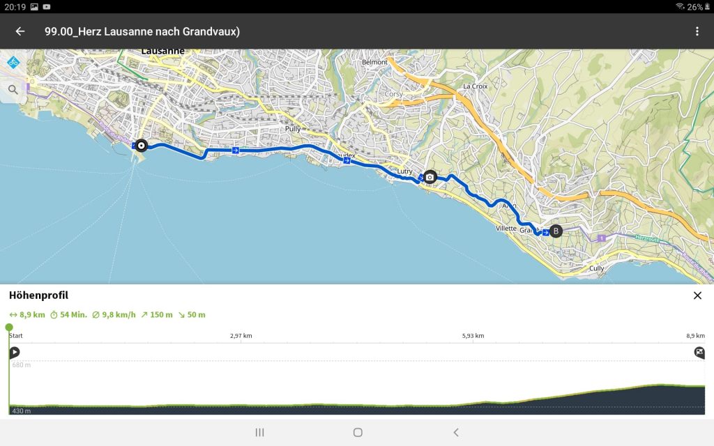 Der Star am Morgen war entspannt. Es ging 2 KM durch Zug zum See und durch die Altstadt zum Einstieg in die Veloroute 99. Ab da ging es dann richtig heftig zur Sache.. Schon nach 6 KM war ein Balken auf dem Display verschwunden. Überwiegend konnten wit den Aufstieg mit der 2. Stufe (von 4 Stufen) Tour bewältigen, aber auch nur, weil wir am Anfang einer Tour waren.