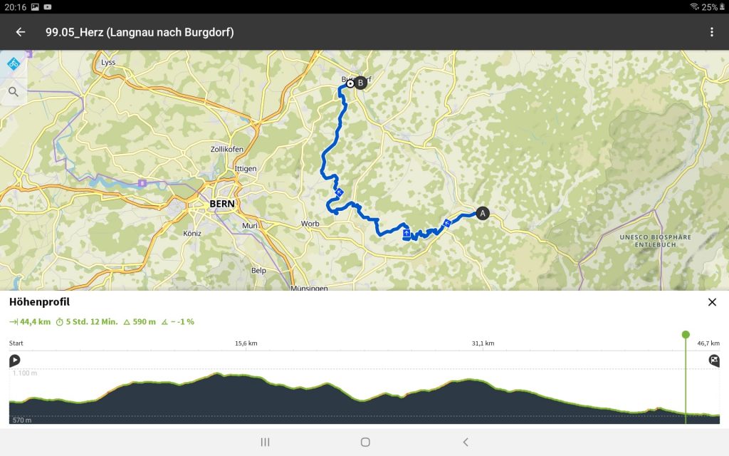 Dieser Tag steht unter dem Motto: Kälte, kräftige Aufstiege und Güllegestank. Schon gleich aus Langenau heraus erwartete uns der erste Buckel. Danach ging es moderat weiter und ab Signau kräftig bergauf. Nach 25 KM hatten unsere Akkus schon 3 von 5 Balken verbraucht, was ein untrügliches Zeichen für eine bergige Strecke ist. Im Rüthihubelbad hatten wir eine Pause eingeplant, die wir auch brauchten, um unsere Akkus wieder aufzuladen und uns aufzuwärmen.