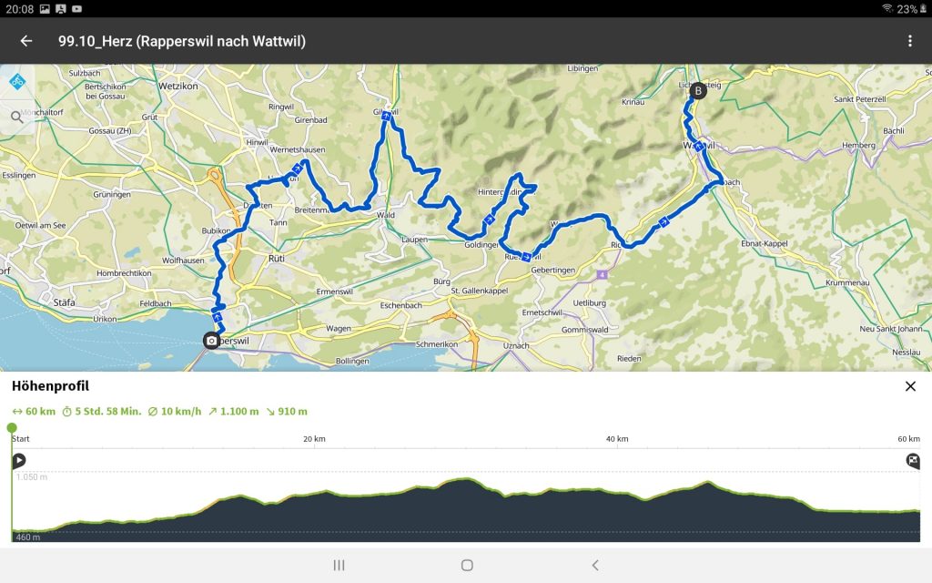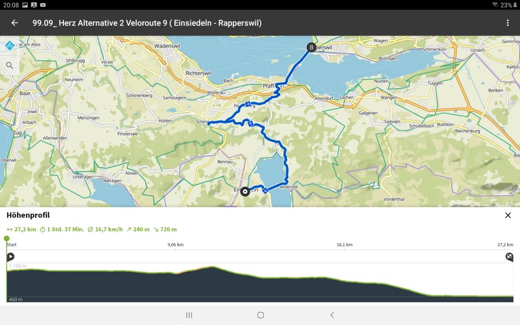 Den Traum durch das mediteran anmutende Rapperswil zubummeln hatten wir am Morgen aufgegeben. Die Frage war nur, auf welcher Route wir die vorhergesagte Wetterlage einigermaßen trocken bis Rapperswil überstehen werden. Wir haben uns dann entschlossen, auf der Veloroute 9 zu fahren. Um nicht aus der Übung zu kommen, mußten wir auf der Strecke auch einen Buckel überwinden. Der allerdings hatte es auch in sich. Ein Schild warnte uns rechtzeitig eine Steigung von 20% zu erklimmen. Wie gut, daß die Akkus bisher geschont wurden. Jetzt waren Muskelkraft und das Sportprogramm gefragt.
