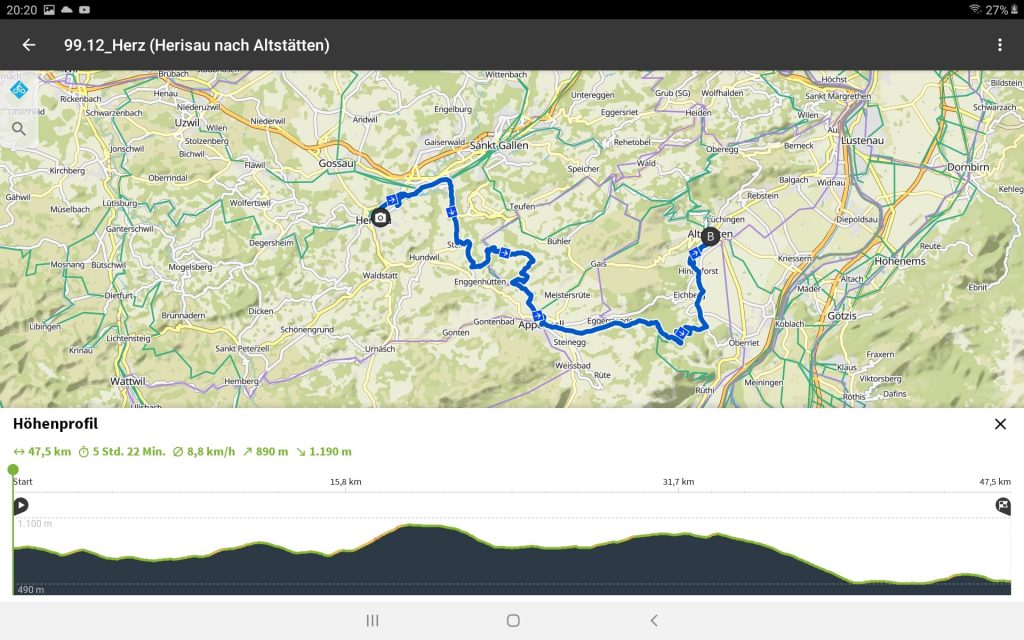 Tourdaten: Strecke 47,5 Kilometer in 3 Stunden und 890 Höhenmeter