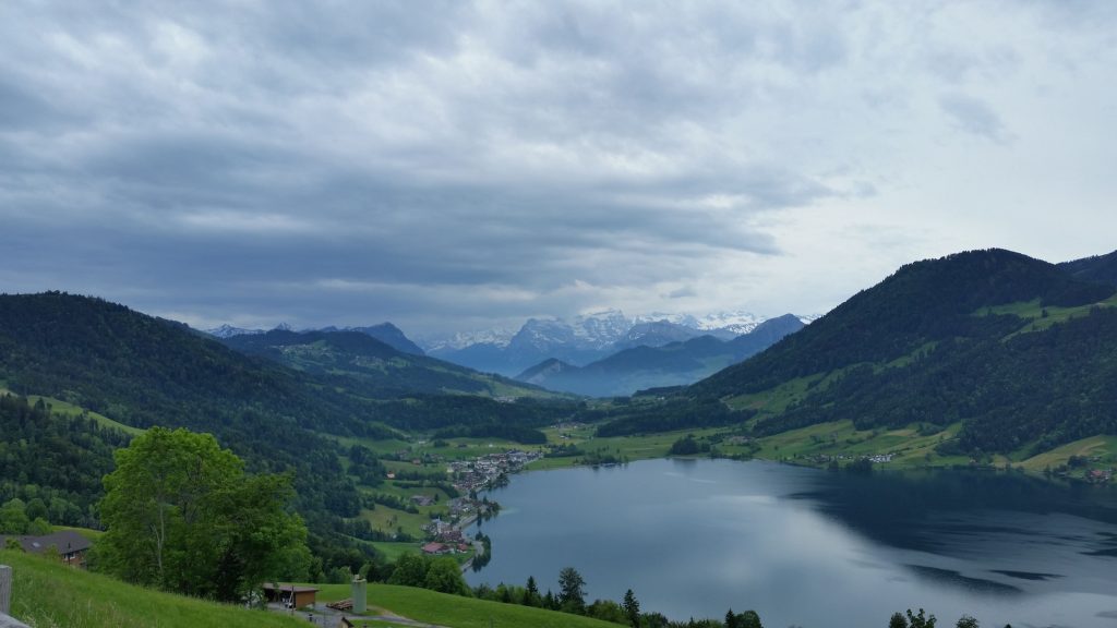 In der Nacht hatte es so geregnet und gewittert, daß wir uns ein Weiterfahren am nächsten Tag nur schwer vorstellen konnten. Morgens um 6:00 Uhr allerdings war keine einzige Wolke mehr am Himmel zu sehen. Leider zog es sich um 8:00 Uhr wieder zu und es war saukalt. Die Temperaturen bewegten sich um 10 Grad. Die Sonnenbrillen konnten wir getrost in den Taschen lassen, dafür wurde alles ,was warm hält, angezogen. Nach 37 KM mit vielen steilen Stücken, hatten wir unsere Pausenstation erreicht. Unsere Akkus hatten bis dahin schon 3,5 von 5 Balken abgearbeitet. Immer mal wieder öffnete sich uns der Blick auf den unter uns liegenden Zürichsee. Leider konnten wir wegen der dichten Bewölkerung nicht die dahinter liegenden Alpen sehen.
