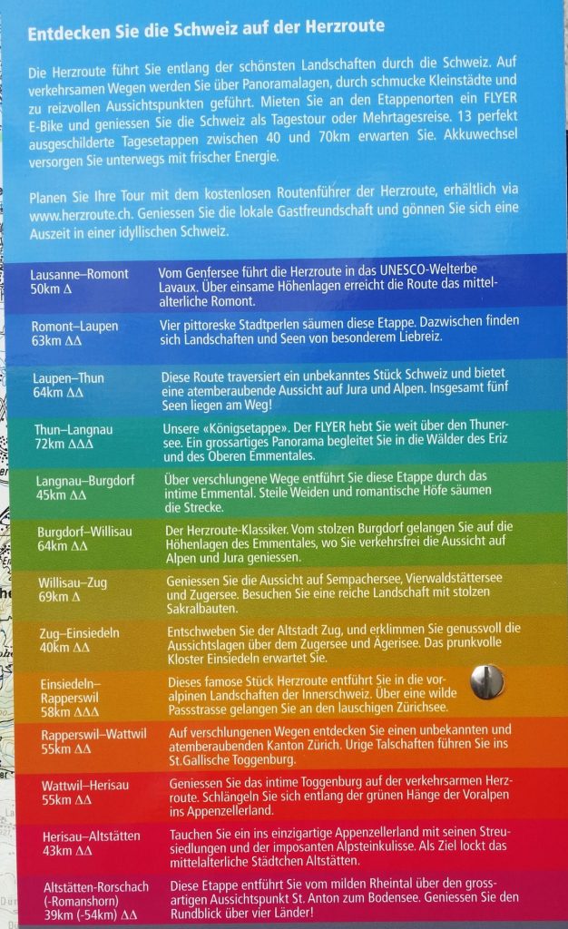 Wir nennen diese Radtour Herzroute, weil die schweizer Veloroute 99 das eigentliche Kernstück dieser Radtour war. An- und Abreise ergaben jeweils drei Tagen, so dass uns diese zusätzlichen sechs Tage eine tolle Schweiz-Rundtour beschert hatten.