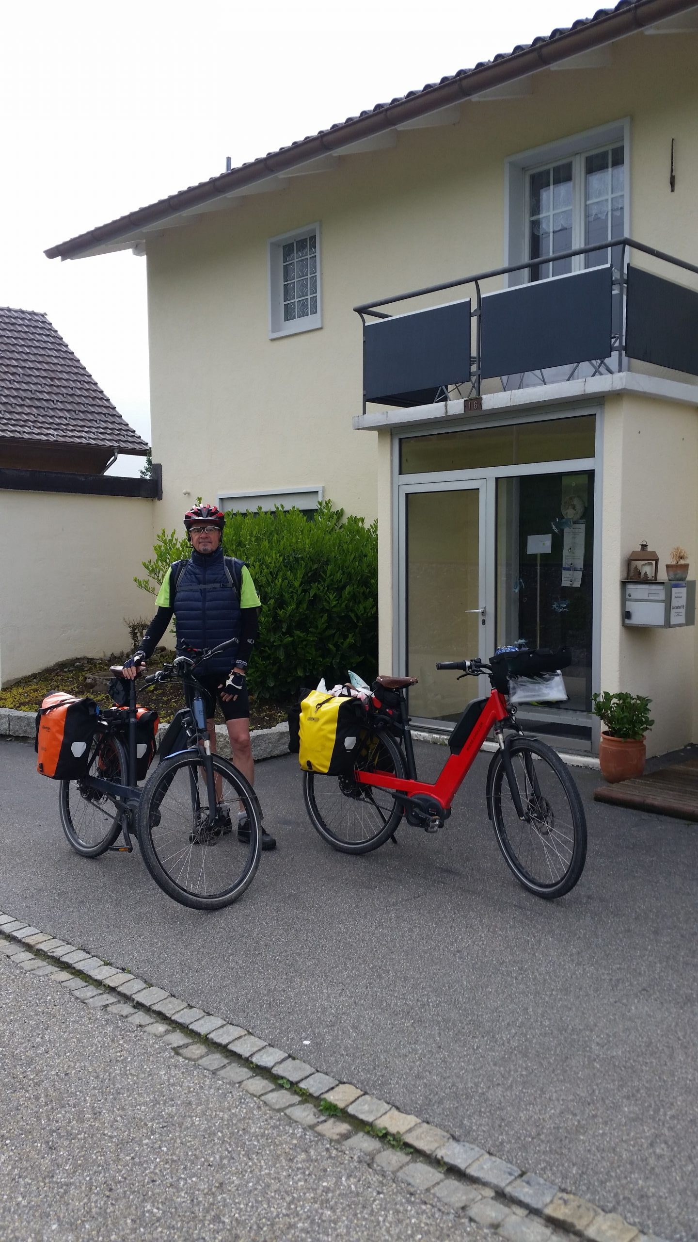 Das Hotel lag direkt neben einer Eisenbahnlinie unterhalb der Autobahn. Dank schallisolierter Fenster war das aber kein Problem. Nur für uns war ein Check-In ohne Personal nur auf Telefonansage. Da wir nicht wußten, wo wir die Räder unterstellen sollten, haben wir sie im Flur des Hotels abgestellt.L