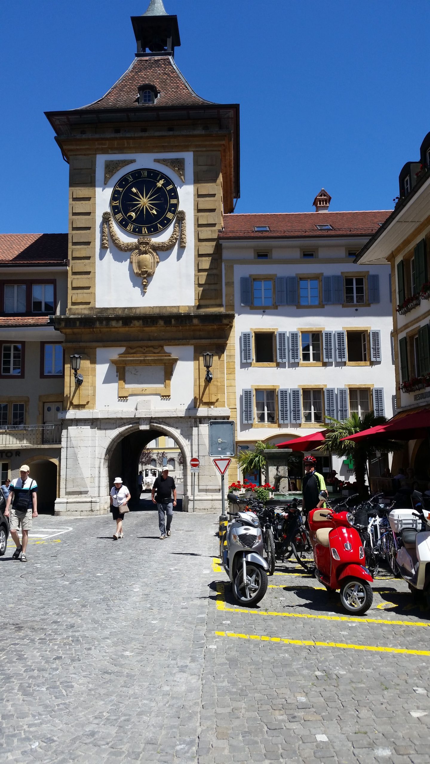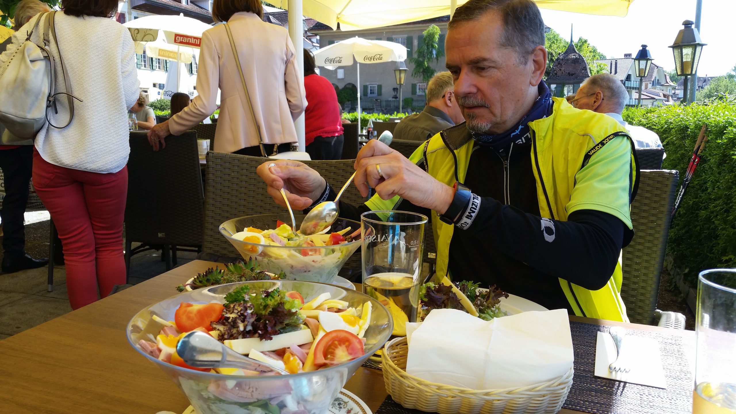 Als wir in Solothurn angekommen waren, hatte sich auch der Nebel aufgelöst. In der ausgesuchten Konditorei haben wir ein leckeres Frühstück genossen, in der Mittagssonne sitzend. Satt und aufgewärmt fuhren wir weiter nach Payerne überwiegend auf der Veloroute 44. Wir begegneten immer wieder Ortschaften,die wir von früheren Radtouren kannten. Sehr schön war die Strecke an der Altaare entlang durch einen Wald. In Lyss war es Zeit für ein Päuschen und einen leckeren Eisbecher.