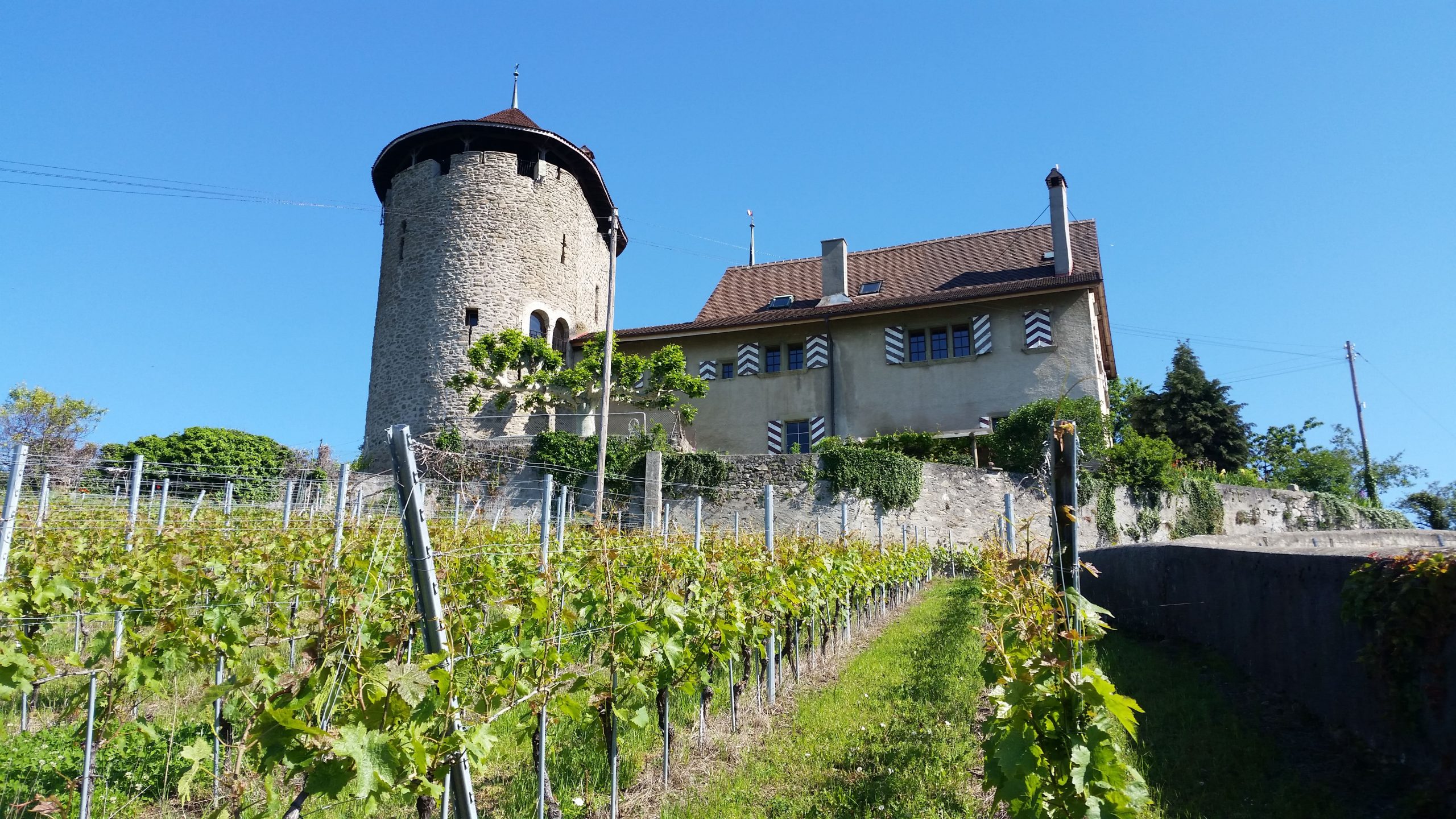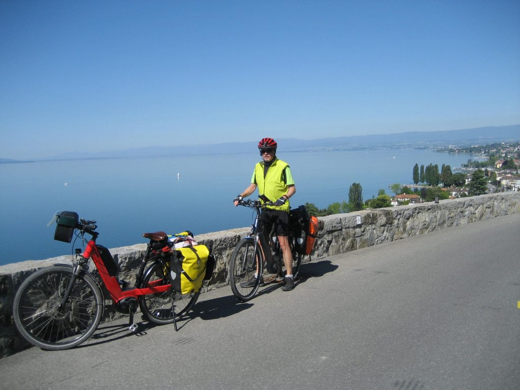 In Lausanne startete die eigentliche Herzroute. Wir folgten der gut markierten Veloroute 99 für einige Kilometer der Straße entlang auf Seehöhe. Von unser Radtour 2012 entlang der Rhone wussten wir aber, daß das ein kurzes Erlebnis ist. Schon bald ging es in die Weinberge. Morgens war der Autoverkehr im Weinberg noch überschaubar. Der Blick über den See auf die walliser und französischen Alpen war unbezahlbar. Am liebsten hätten wir dauernd Fotostopps gemacht, wussten aber, daß kein Foto diese gewaltigen Eindrücke einfangen kann.
