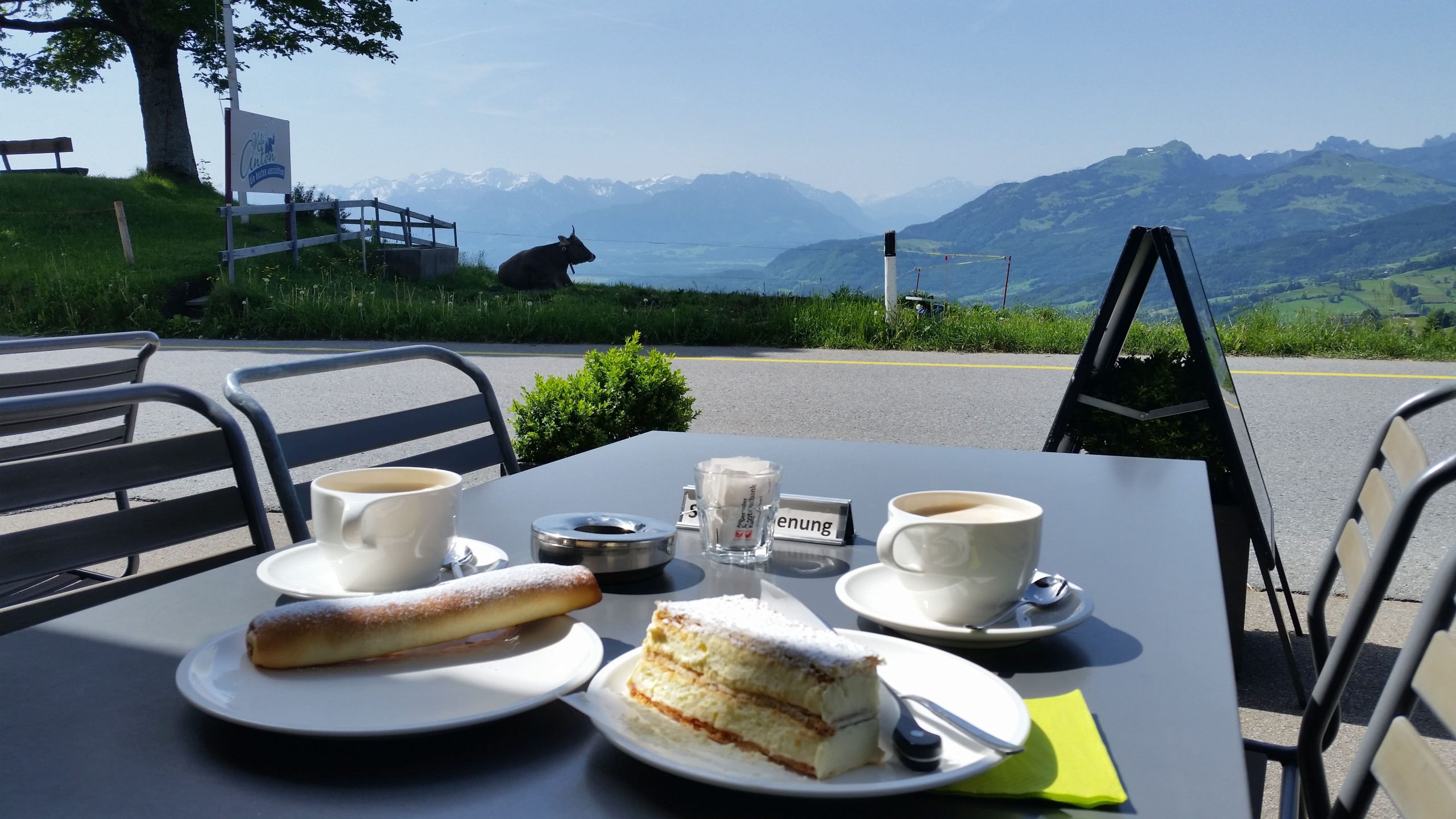 Oben angekommen sind wir in eine echte schweizer Gartenwirtschaft gekommen. Wir hätten schon gerne früher eine Pause gemacht, aber Bänke gab es nicht und Norbert weigerte sich auf einer Wiese, wie er sich ausdrückte Güllewiese, zu pausieren. Endlich haben wir die Zivilisation wieder erreicht, waren aber überrascht, wie lange sich 4 KM ziehen können.