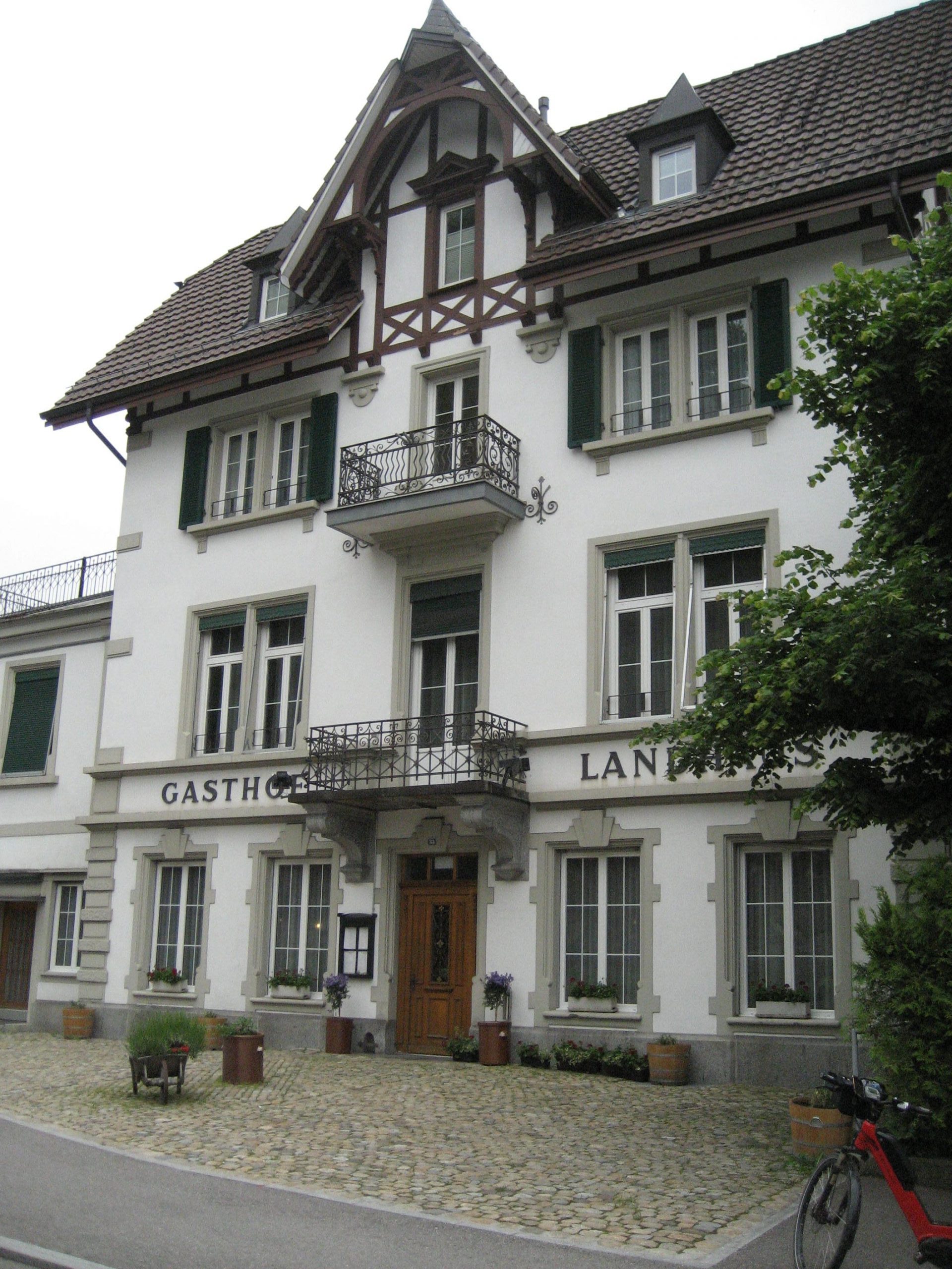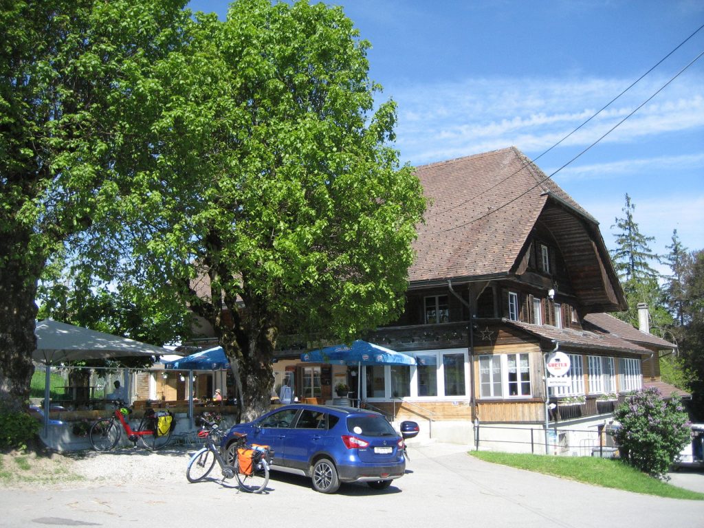 Irgendwann tauchten wir in Wälder und steile Wiesenlandschaften ein. Ca. 20 KM vor Ende der Tour, mußten wir unsere Akkus aufladen. Langsam zogen sich Wolken über uns zusammen und es fing an, sich abzukühlen. In der Ferne hörten wir schon Gewittergrummeln. Ein bißchen spannend war die Quartiersuche. Einige Lokalitäten im Zielgebiet (Signau / Langenau) waren ausgebucht, andere hatten Ruhetag. Wir hatten Glück in Langenau im Gasthof Hirschen noch ein Doppelzimmer zu ergattern. Wir sind dort nach dieser Tour ziemlich müde angekommen. Da wir unterwegs ausgiebig gegessen hatten, konnten wir nicht einmal mehr die prämierte Küche des Gasthofs testen.