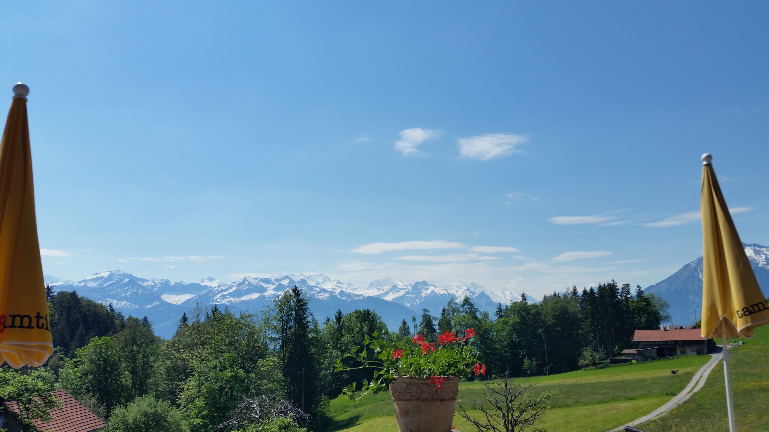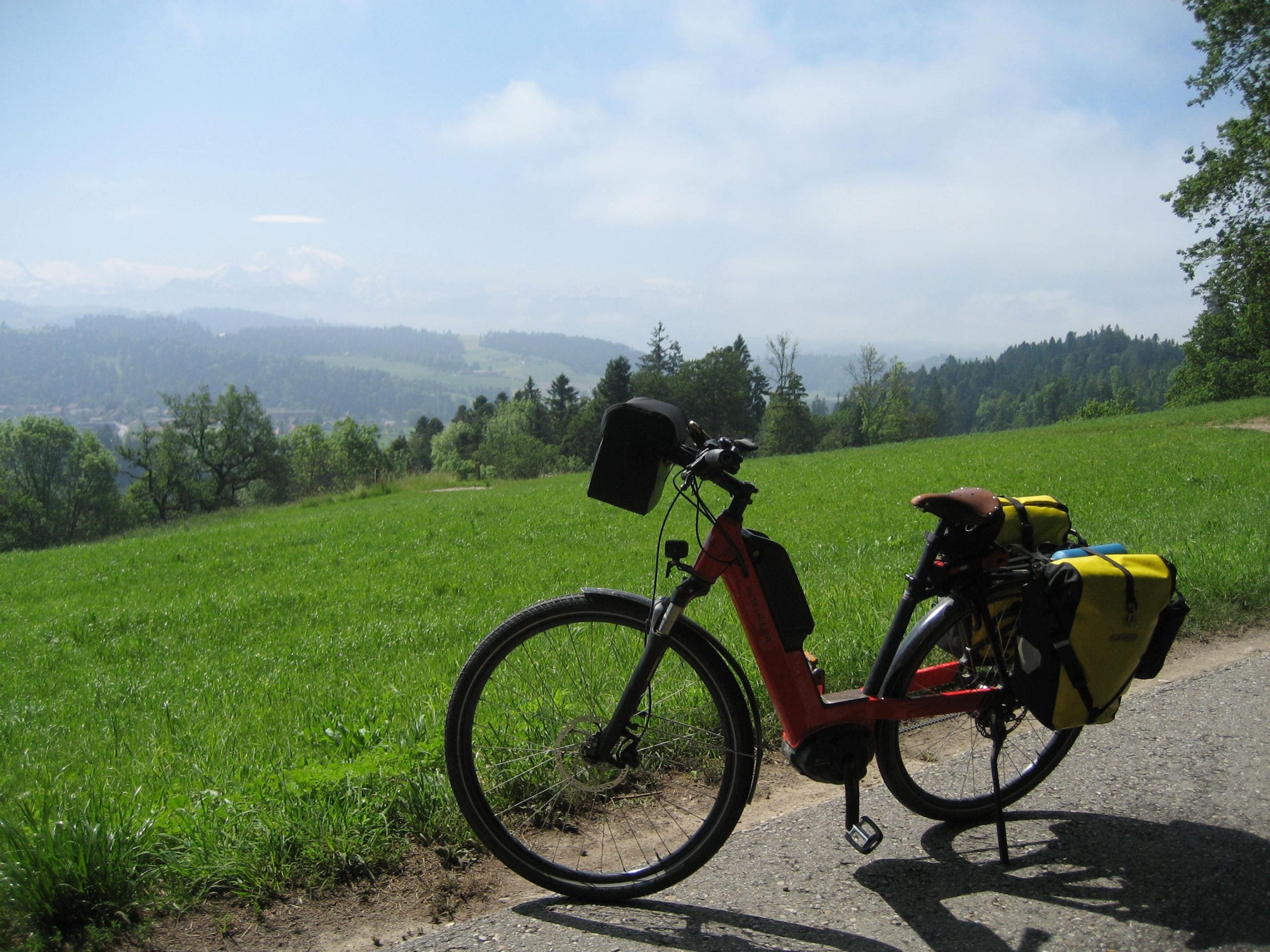 Los ging es dann erst einmal ziemlich ruhig. Aber schon bald bogen wir vom See ab und kurbelten unsere Räder auf über 1000 Höhenmeter. Wie geplant, pausierten wir im Gasthof Rothorn, um unsere Akkus und auch uns wieder aufzuladen. Wir hatten zwar die erste 1000er Marke erreicht – es war verhältnismäßig harmlos, aber an Ausruhen war nicht zu denken. Es ging ständig mehr oder weniger herauf und herunter. Es wurde zunehmend anstrengender. Zunächst hatten wir noch großartige Fernsicht auf die Berner Alpen und den Thuner See.