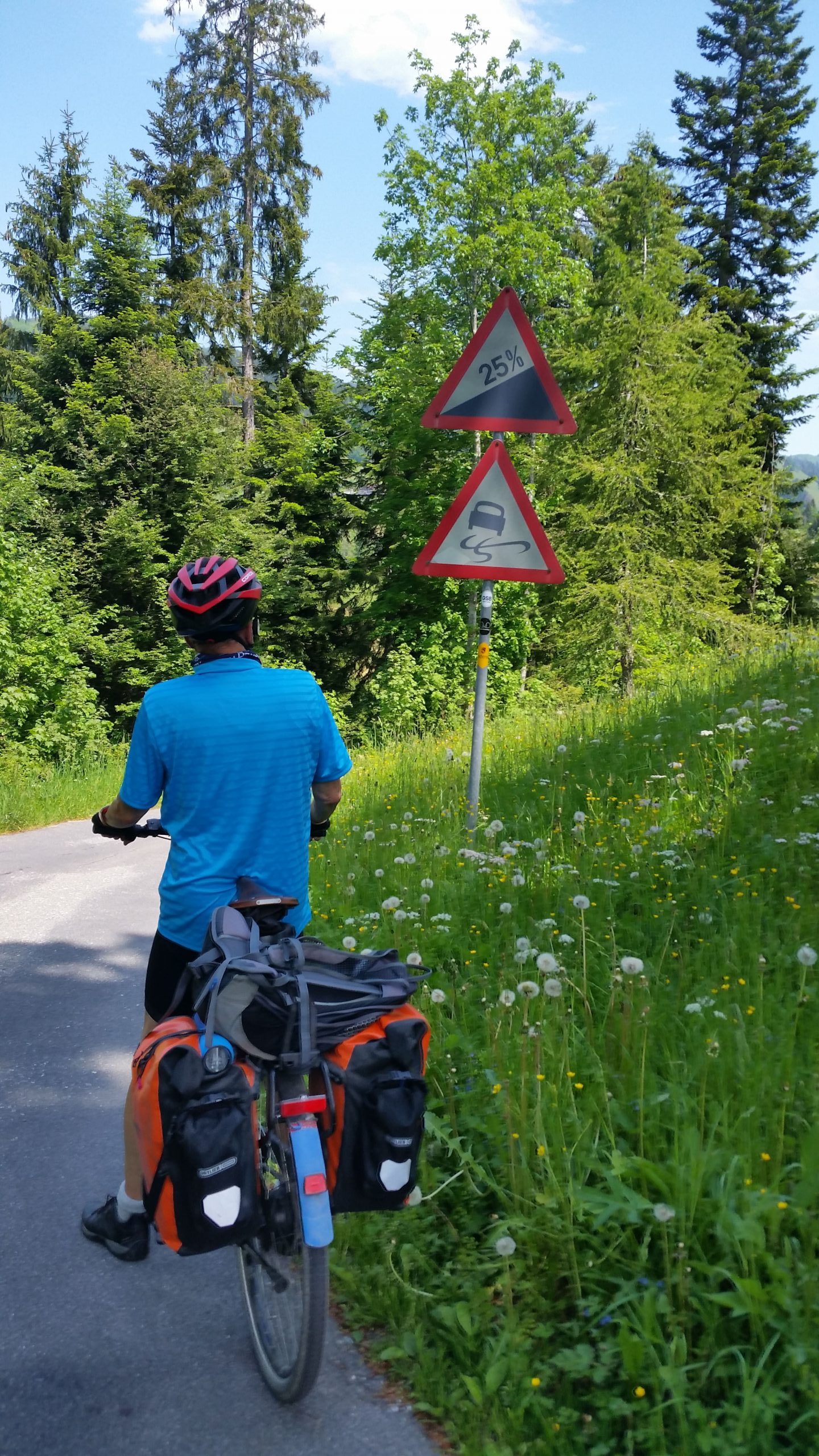 Den Traum durch das mediteran anmutende Rapperswil zubummeln hatten wir am Morgen aufgegeben. Die Frage war nur, auf welcher Route wir die vorhergesagte Wetterlage einigermaßen trocken bis Rapperswil überstehen werden. Wir haben uns dann entschlossen, auf der Veloroute 9 zu fahren. Um nicht aus der Übung zu kommen, mußten wir auf der Strecke auch einen Buckel überwinden. Der allerdings hatte es auch in sich. Ein Schild warnte uns rechtzeitig eine Steigung von 20% zu erklimmen. Wie gut, daß die Akkus bisher geschont wurden. Jetzt waren Muskelkraft und das Sportprogramm gefragt.