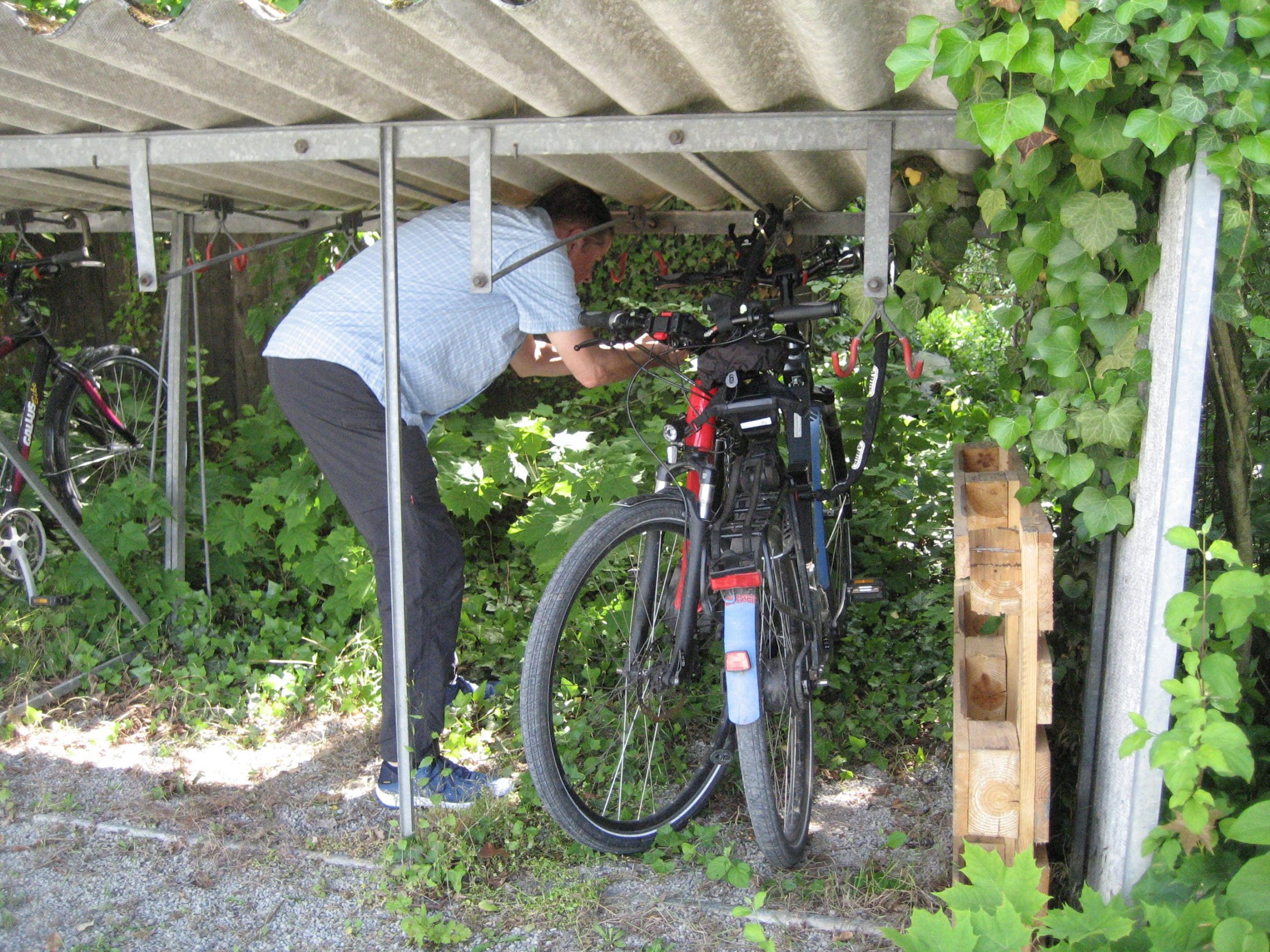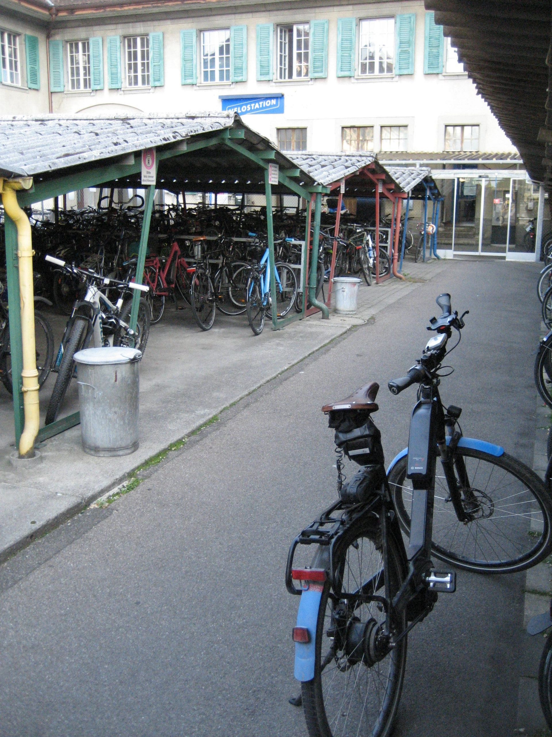 Das Gewitter ist weiter gezogen und es wurde zunehmend heißer. Nach dem Frühstück sind wir mit der Bahn zur Aareschlucht gefahren. Da wir die Räder nicht mehr im Gästebereich des Hotels stehen lassen konnten, brachten wir sie vor der Bahnfahrt zu einer bewachten Velostation am Bahnhof. Wir hatten Glück dort zwischen den vielen Rädern um 9:00 Uhr früh noch zwei Stellplätze zu bekommen.
