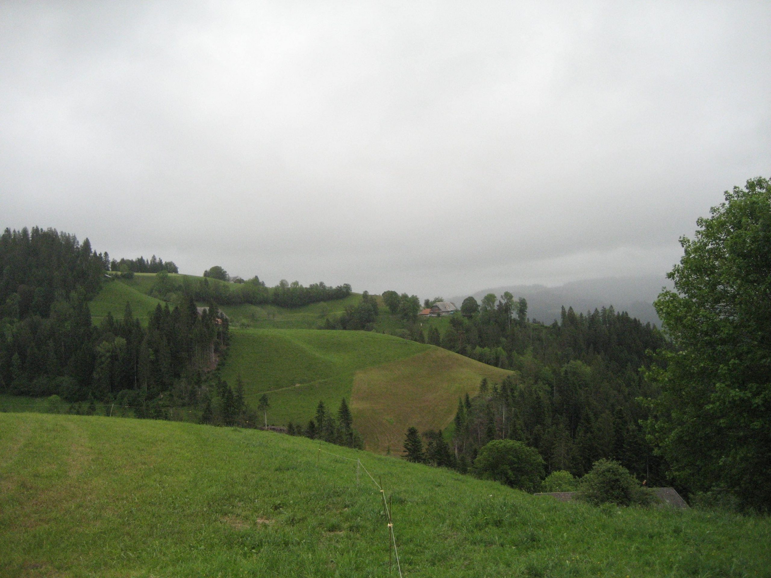 Der Blick am Morgen aus dem Fenster war ziemlich trostlos – Nebel. Die Temperaturen fühlten sich auch nicht gerade sommerlich an. wir hatten somit die Möglichkeit weiter Kleidungstücke aus unserem Gepäck zu testen. Wir fuhren los, gerade so warm, daß wir nicht auf dem Rad fest froren. Bald ließen wir den schönen beschaulichen Radweg an der Emme hinter uns und es ging bergauf. Nach 10 KM hatte der Akkus bereits seinen ersten Balken eingebüßt, nach 22 KM den zweiten. Wir fuhren an einigen Panoramatafeln vorbei, die erahnen ließen, daß man auf der Strecke eine tolle Fernsicht haben könnte. Der Nebel löste sich leider aber erst gegen Mittag auf. Offensichtlich ist das Gebiet auch ein beliebtes Wandergebiet. Es gab auch viele schön gelegene Bänke, die bisher Mangelware waren. Aufgrund des Nebels konnten wir das alles nicht so genießen.