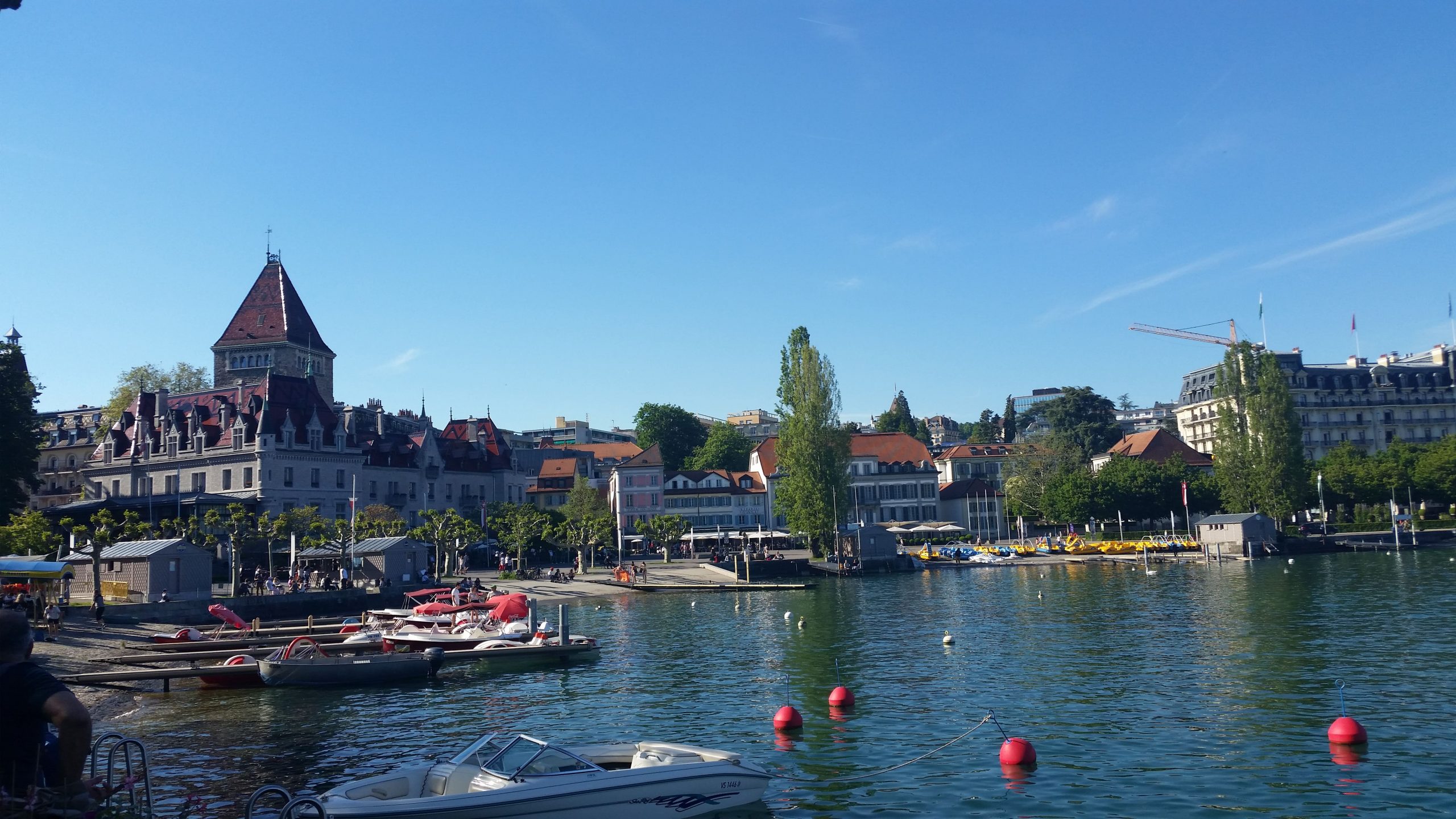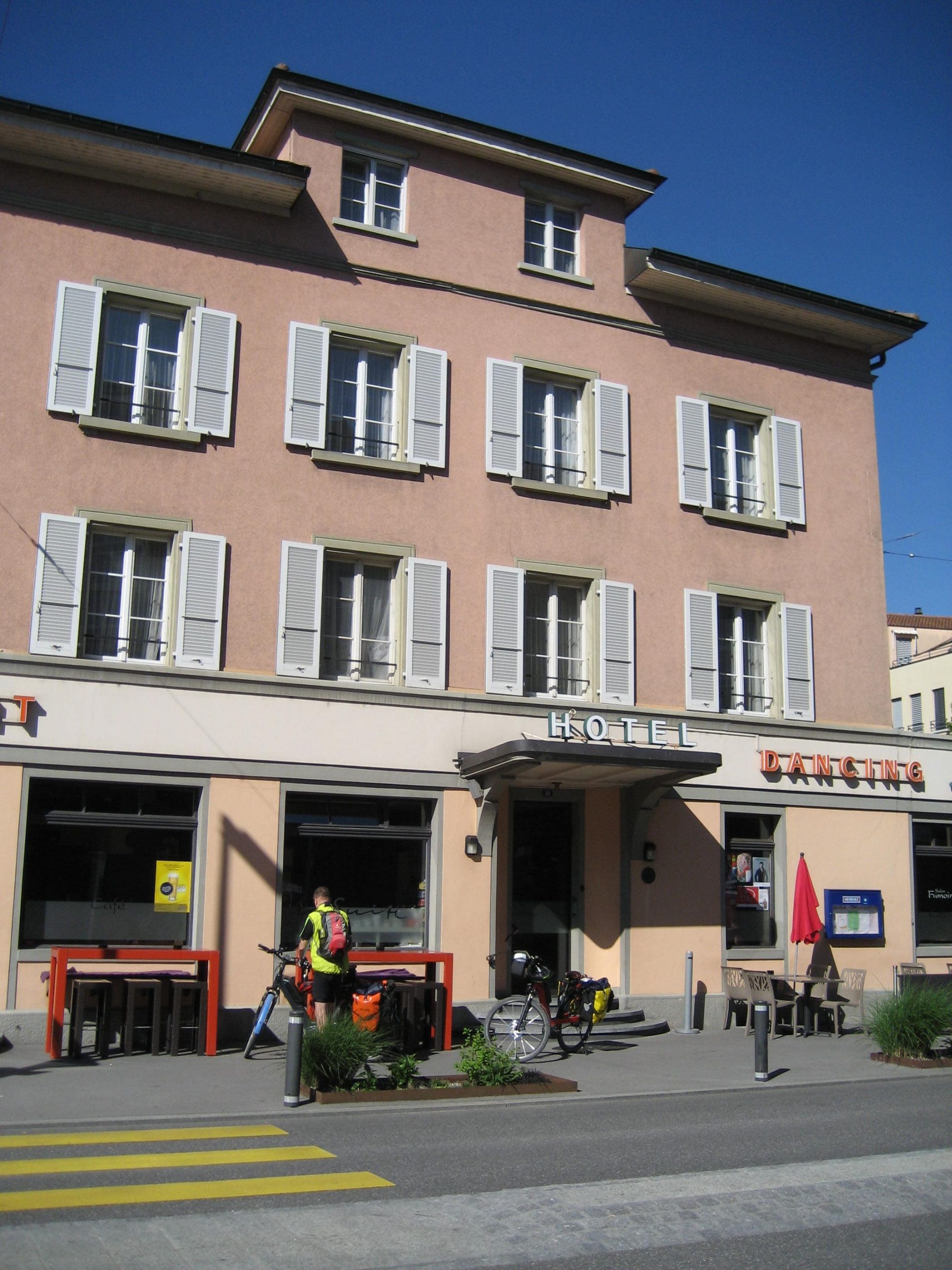 Mit recht müden Beinen und dem Nobock-Syntom erreichten wir den nördlichen Teil von Lausanne. Wir rollten dann 45 Minuten bergab durch die Stadt bis zu unserem Hotel direkt am See. Das Hotel war wieder einmal deal für einen Waschtag, da das Badezimmer ein Fenster zum Dach hinaus hatte. Nach der Ruhe während der Radetappen bekamen wir in Lausanne fast einen Zivilisationsschock. Es gab dort viele Menschen, Autos und viele Motoräder.