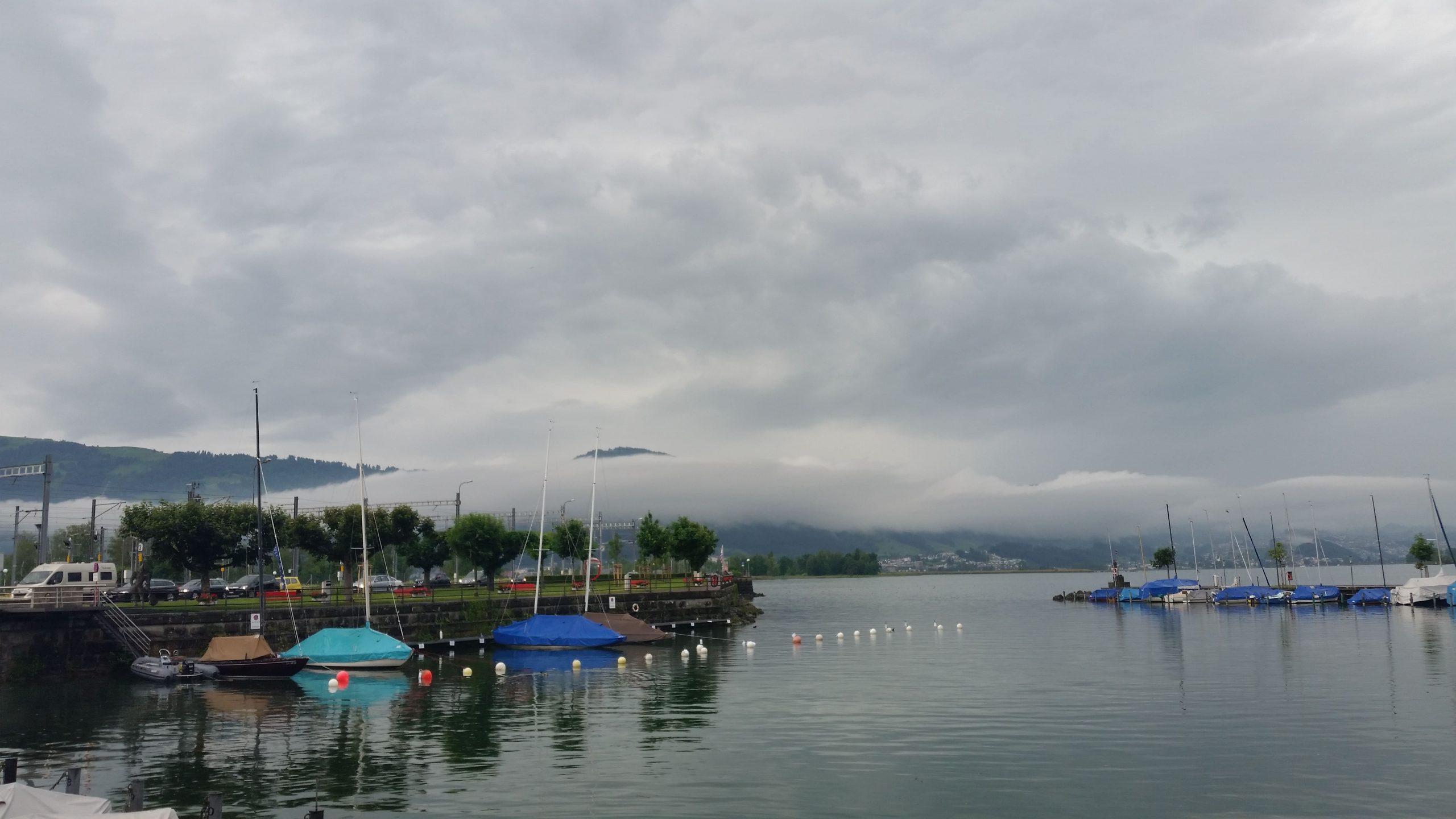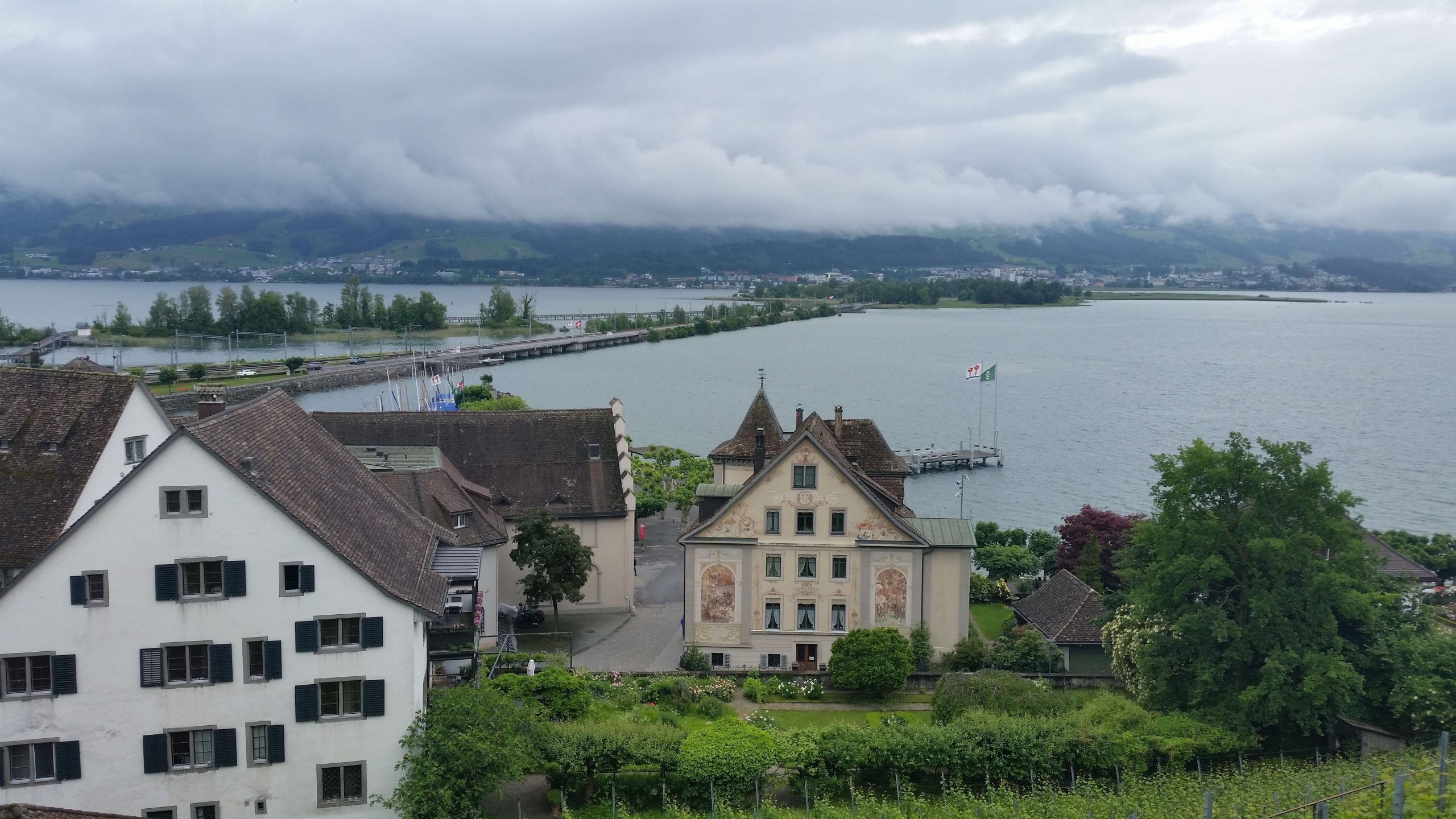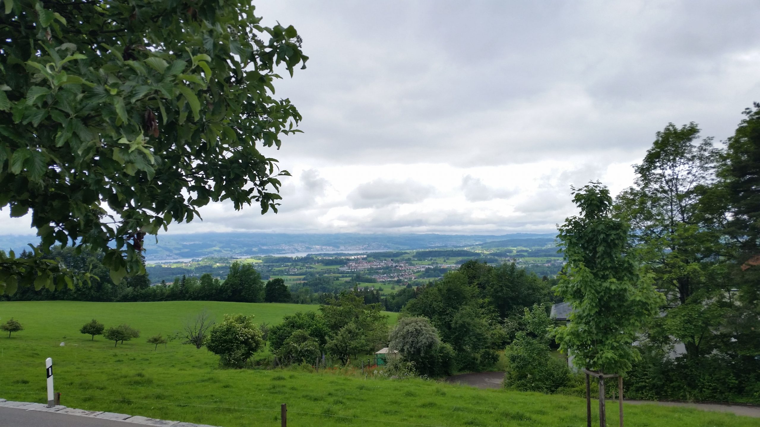 In der Nacht hatte es so geregnet und gewittert, daß wir uns ein Weiterfahren am nächsten Tag nur schwer vorstellen konnten. Morgens um 6:00 Uhr allerdings war keine einzige Wolke mehr am Himmel zu sehen. Leider zog es sich um 8:00 Uhr wieder zu und es war saukalt. Die Temperaturen bewegten sich um 10 Grad. Die Sonnenbrillen konnten wir getrost in den Taschen lassen, dafür wurde alles ,was warm hält, angezogen. Nach 37 KM mit vielen steilen Stücken, hatten wir unsere Pausenstation erreicht. Unsere Akkus hatten bis dahin schon 3,5 von 5 Balken abgearbeitet. Immer mal wieder öffnete sich uns der Blick auf den unter uns liegenden Zürichsee. Leider konnten wir wegen der dichten Bewölkerung nicht die dahinter liegenden Alpen sehen.