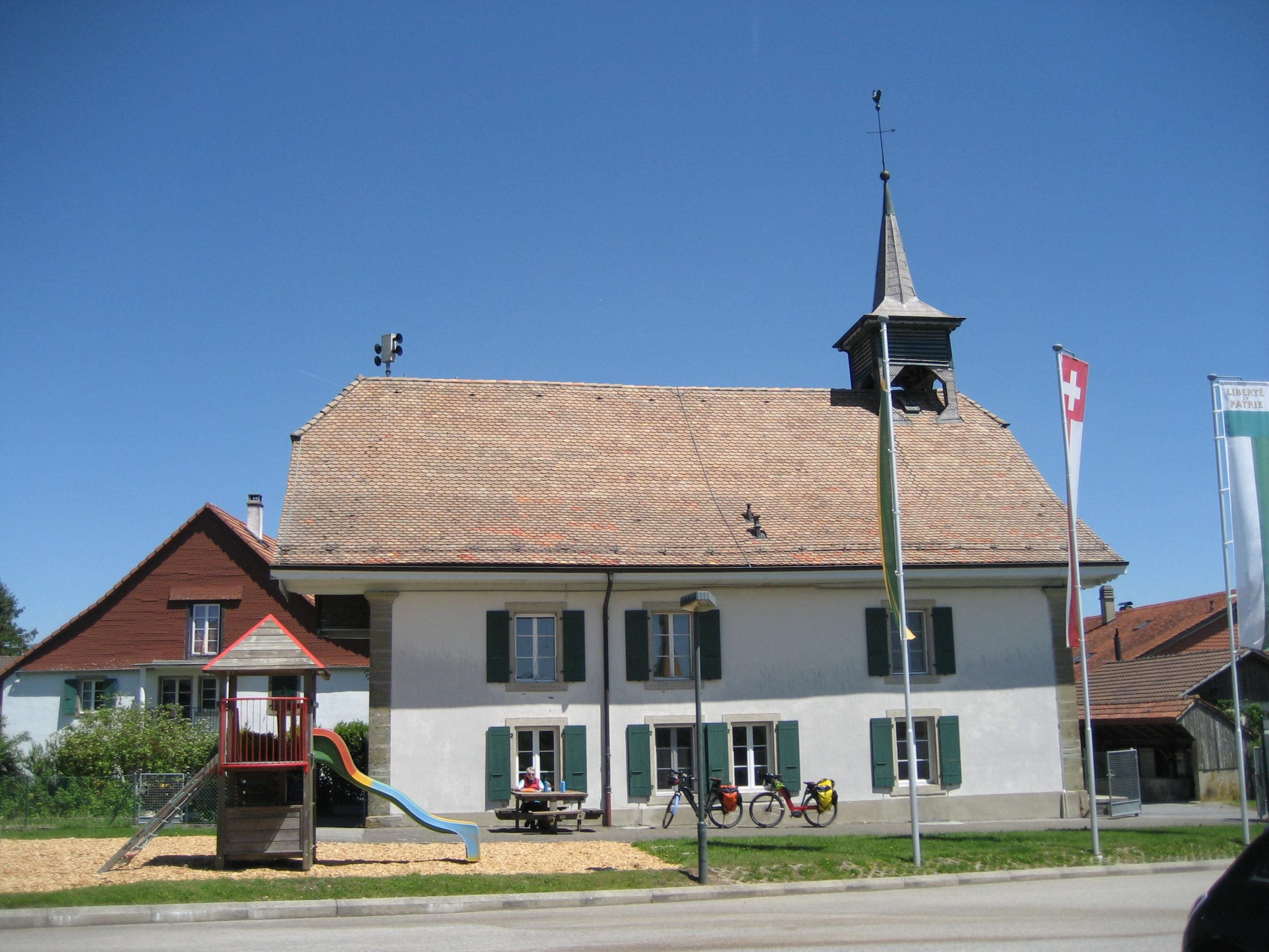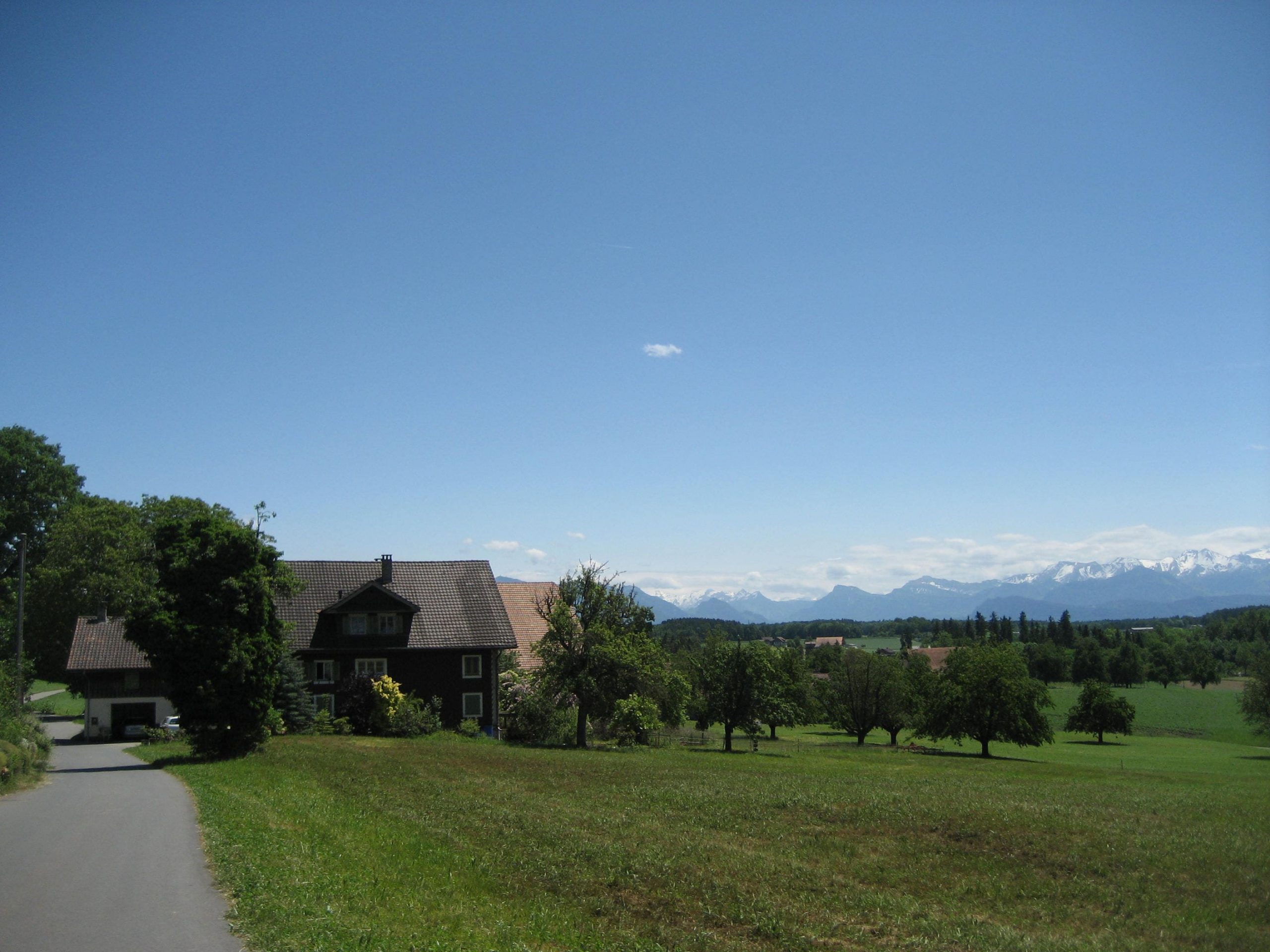 Endlich konnten wir bei relativ angenehmen Temperaturen und Sonnenschein starten. Es ging weiter auf der Veloroute 44. Der Einstieg in die Tagestour war heute schnell gefunden. Die Strecke war sehr schön. Erst ging es ziemlich eben voran. Später stieg es sanft an und die nächsten 90 Minuten mußten wir bedeutend mehr aus unseren Beinen und Akkus heraus holen. Dann wurden wir aber mit einer traumhaften Alpensicht belohnt. Nun träumten wir von einer schönen Bank im Schatten, um unsere Picknick zu genießen. Wie man auf dem Bild sehen kann, klappte es mit dem Schatten nicht ganz so. Dafür hatten wir auf einem leeren Schulhof einen Tisch und Bänke.Torsten und Lucys Almkäse und unser selbst gebackenes Roggenbrot waren eine wahre Delikatesse.