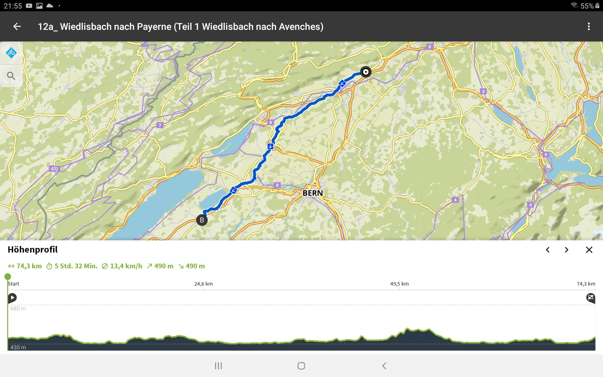 Tourdaten: Strecke 74 Kilometer in 5 Stunden und 1600 Höhenmeter