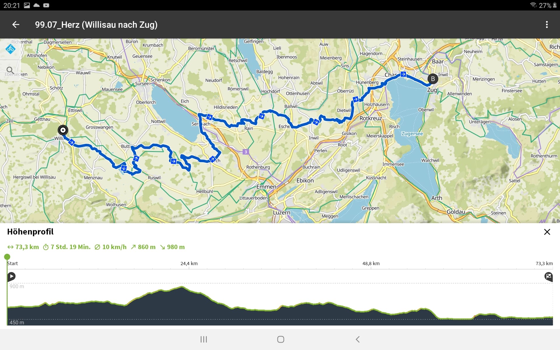 Der Star am Morgen war entspannt. Es ging 2 KM durch Zug zum See und durch die Altstadt zum Einstieg in die Veloroute 99. Ab da ging es dann richtig heftig zur Sache.. Schon nach 6 KM war ein Balken auf dem Display verschwunden. Überwiegend konnten wit den Aufstieg mit der 2. Stufe (von 4 Stufen) Tour bewältigen, aber auch nur, weil wir am Anfang einer Tour waren.
