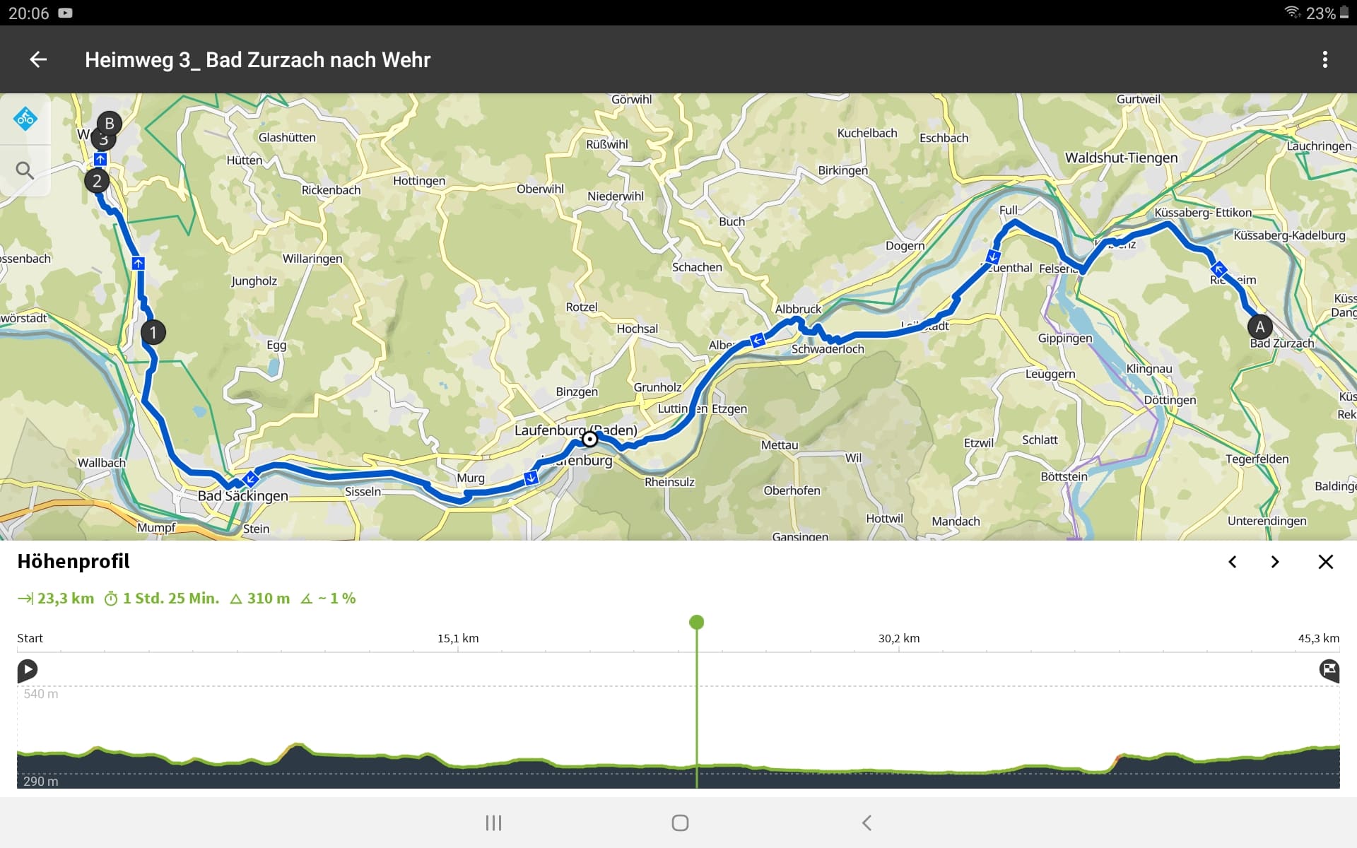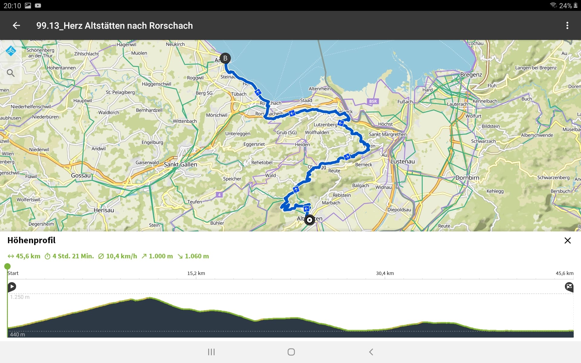 Tourdaten: Strecke 45,9 Kilometer in 2:24 Stunden und 320 Höhenmeter