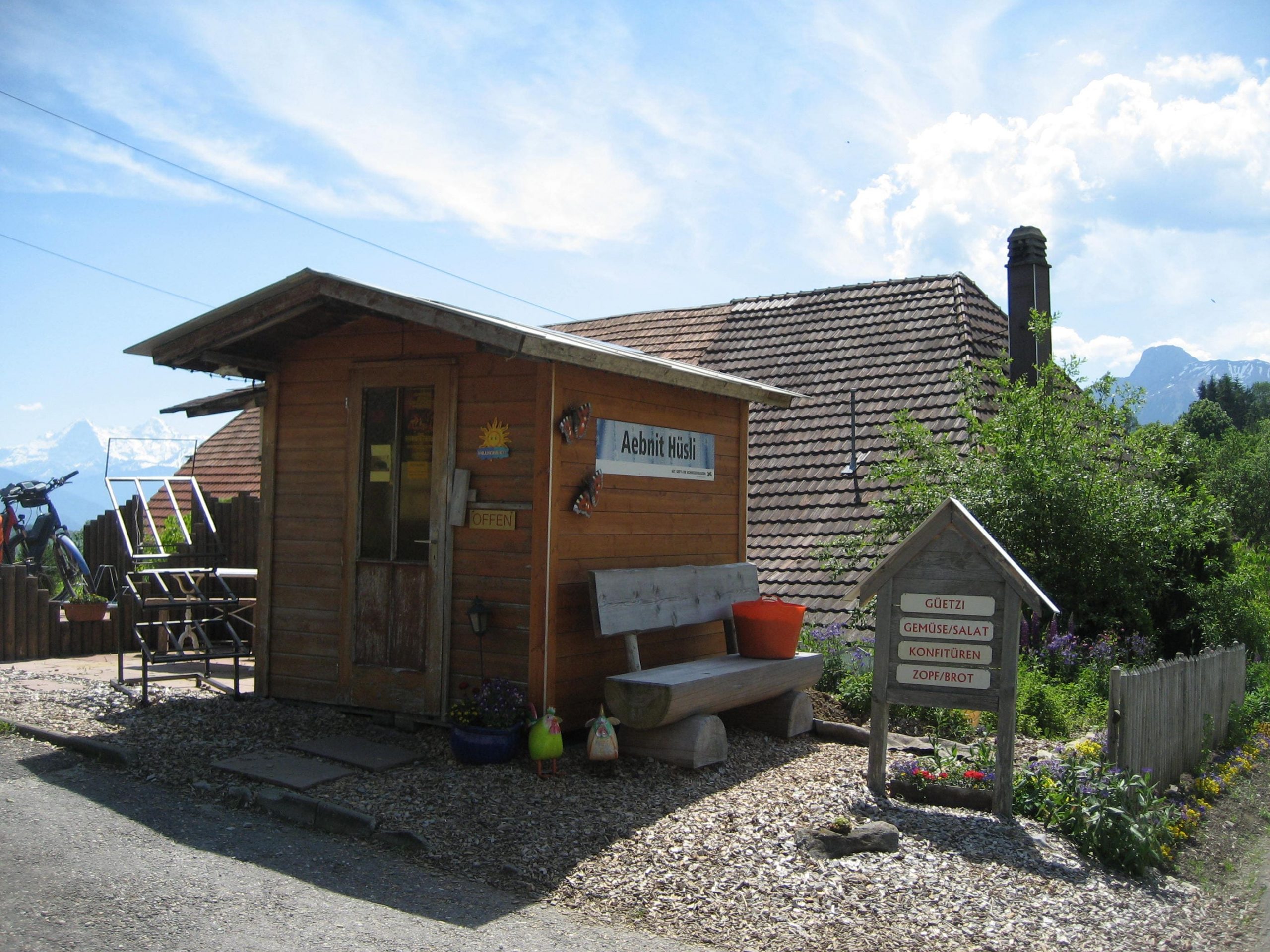 Auf dem weiteren Weg mußten wir unbedingt einen Stopp am Aebnit Hüsli machen. Das ist ein perfekter mini Selbstbedienungsladen mit Bänken, Tisch und Veleoparkplatz.