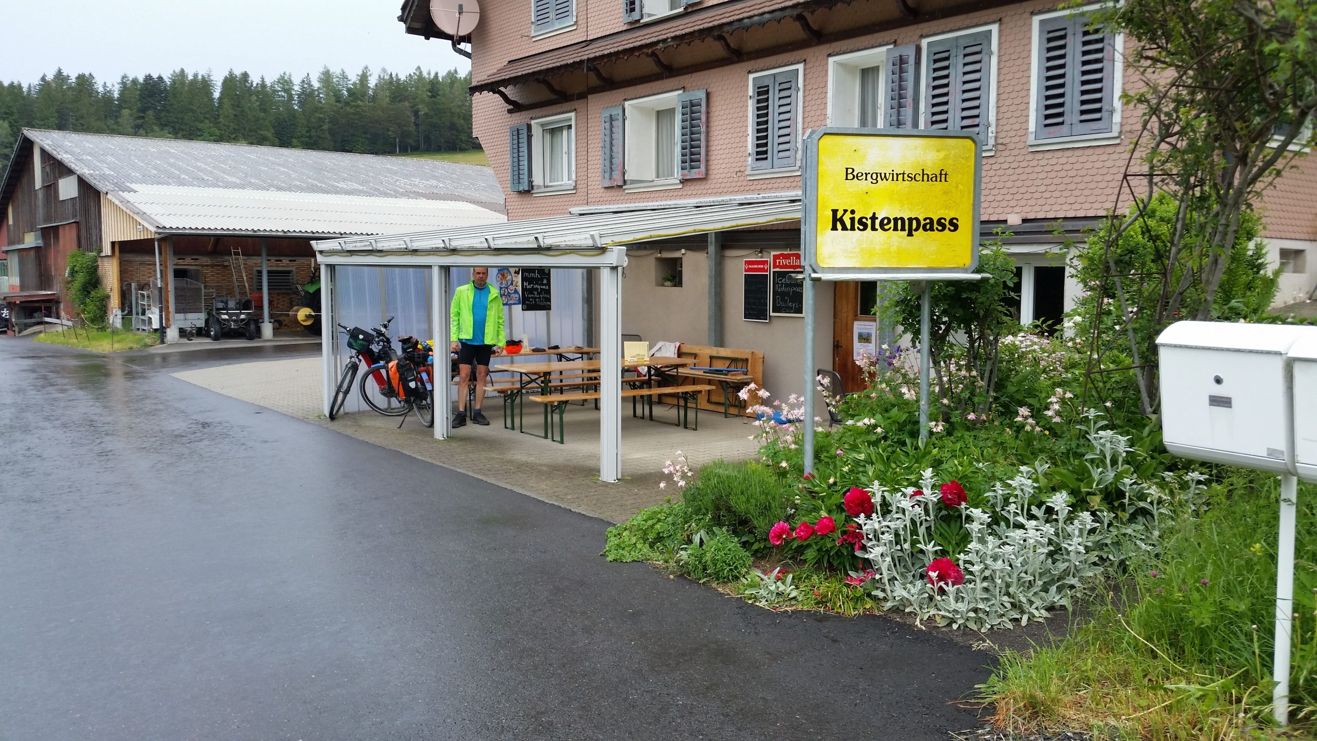 Oben auf dem Kistenpass angekommen, fing es an zu nieseln. Wir verließen hier die mit Komoot geplante Strecke und folgten der Ausschilderung der Veloroute 99 durch den Wald. Es ging weitgehend moderat weiter. Erst hinter dem Ägerisee stieg es wieder heftig an. Der Regen wurde auch stärker, aber es gab einen Lichtblick – die Bergwirtschaft Kistenpass. Vor uns lagen noch ca. 22 KM und wir wollten den regen abwarten. Daher kehrten wir ein, luden unsere Akkus auf und aßen eine Kleinigkeit. Der Regen hörte bald auf und wir starteten bei angenehmen Klima zu unserer Schlußetappe auf.