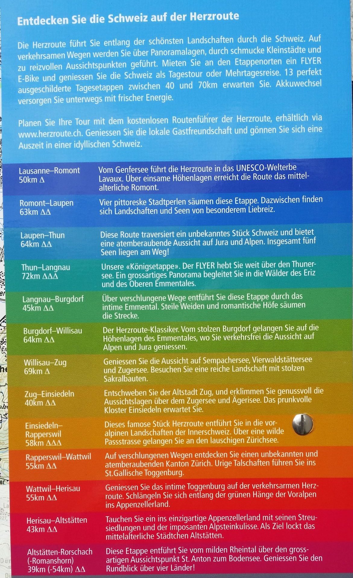 Wir nennen diese Radtour Herzroute, weil die schweizer Veloroute 99 das eigentliche Kernstück dieser Radtour war. An- und Abreise ergaben jeweils drei Tagen, so dass uns diese zusätzlichen sechs Tage eine tolle Schweiz-Rundtour beschert hatten.