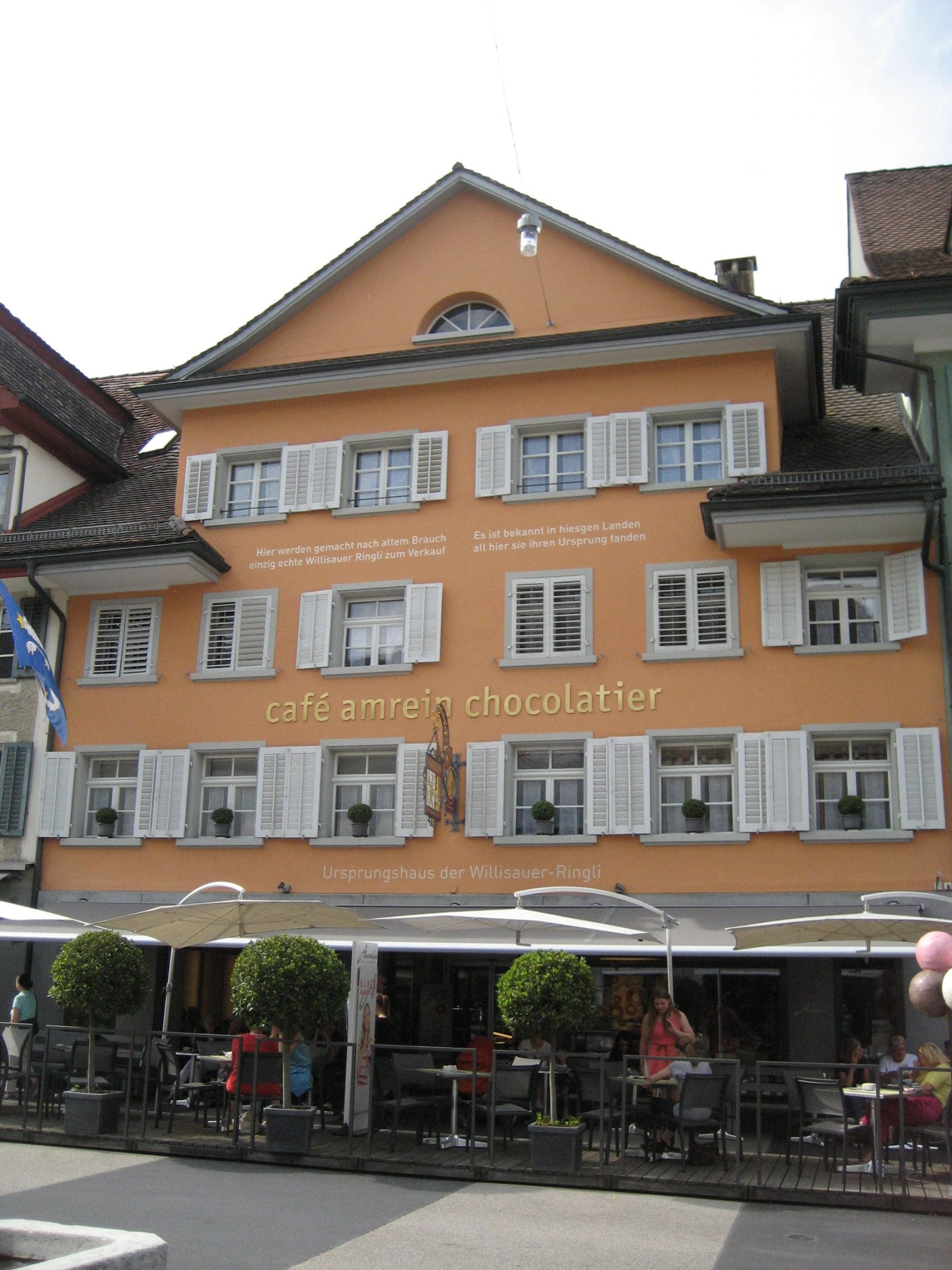 Die weitere Strecke führte durch eine grüne, viel sanftere Gegend als bisher. Es war eine ständiges auf und Ab aber nicht übermäßig steil. In Madiswil einer von Flyer eingerichteten Akkuwechselstation, wollten wir unsere Akkus aufladen. Leider wurde nur ein Akku aufgeladen, da irgendjemand beim zweiten Akku einfach den Stecker gezogen hatte. Norbert mußte deshalb ohne die Sicherheit unbegrenzt Power zu haben, weiter fahren. Aus Solidarität habe ich auch nur selten in den nächst höheren Gang geschaltet. Schließlich erreichten wir Willisau und kehrten in dem angesagtesten Cafe des Ortes ein. Wir lernten dort die Willisauer Kringli kennen. Wir wurden auch gleich eingeweiht, wie diese knochenharten Teile zu genießen sind – den Kringel auf die offene Hand legen und mit dem Ellenbogen des anderen Arms zertrümmern. Dann kann man die einzelnen Stücke genießen.