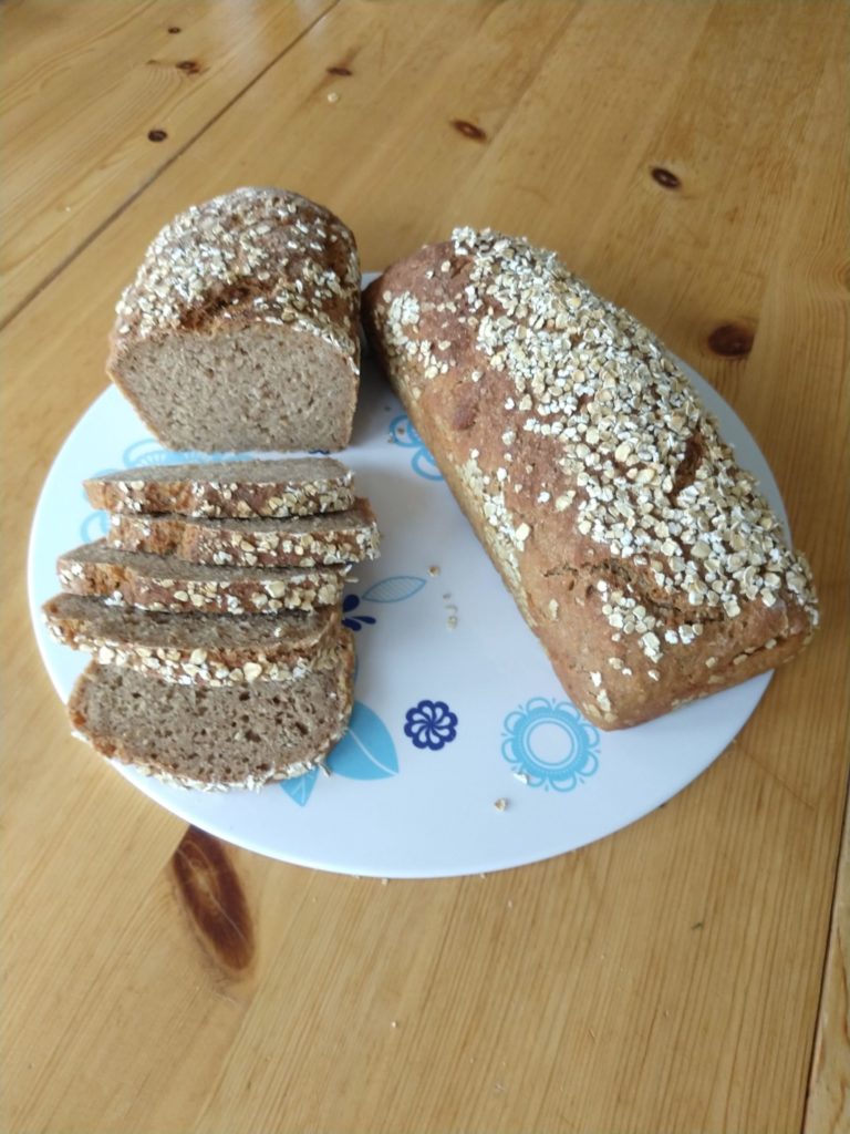 In der nächsten Stunde den Teig mehrmals ziehen, falten und rund wirken. Backformen fetten und den Teig halbieren. Die Teigstücke länglich formen. Die Teiglinge mit Wasser bestreichen, in der Flockenmischung wälzen und in die Backformen geben. Danach die Teiglinge nochmals ca.30 Minuten abgedeckt gehen lassen. Währenddessen den Backofen auf 220 Grad vorheizen. Ein Backblech mit Wasser unten im Backofen mit erhitzen. Sobald die Brote in den Ofen geschoben werden, das Wasserblech herausnehmen und die Brote für 35 – 40 Minuten backen. Nach der Backzeit die Brote aus der Form nehmen und weitere 5 Minuten in den Backofen schieben. Dabei die Ofenklappe mit einem Holzlöffel geöffnet halten.