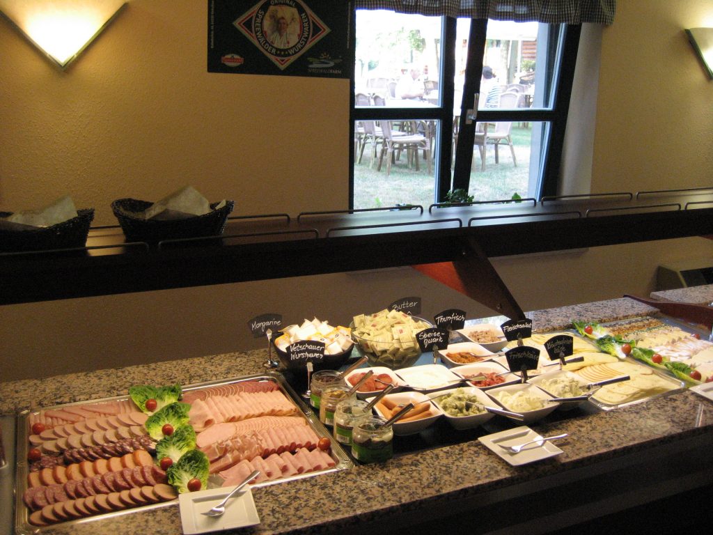 Die Landschaft wurde wieder weitläufiger, es gab weniger Querarme der Spree und damit weniger kleine Brücken. Schließlich erreichen wir die Stadt Burg. In der “Radscheune” machten wir endlich eine Pause und aßen etwas aus dem offensichtlich ortstypischen Angebot – saure Eier und Wurstgulasch. Es schien uns noch das harmloseste Essen zu sein. Wir betrachteten es als Versuch, die regionale Küche zu testen, sind aber vorsichtiger geworden.