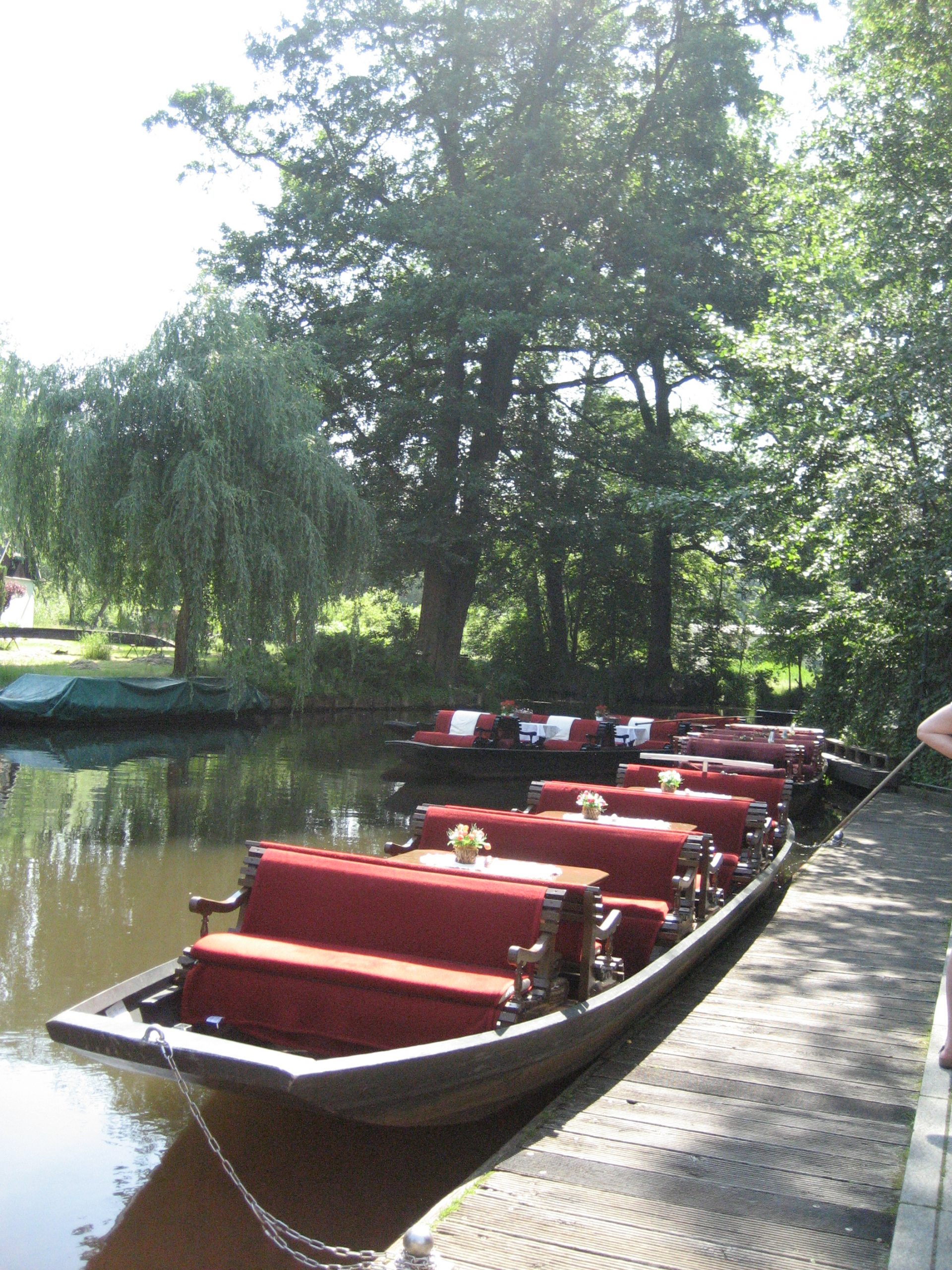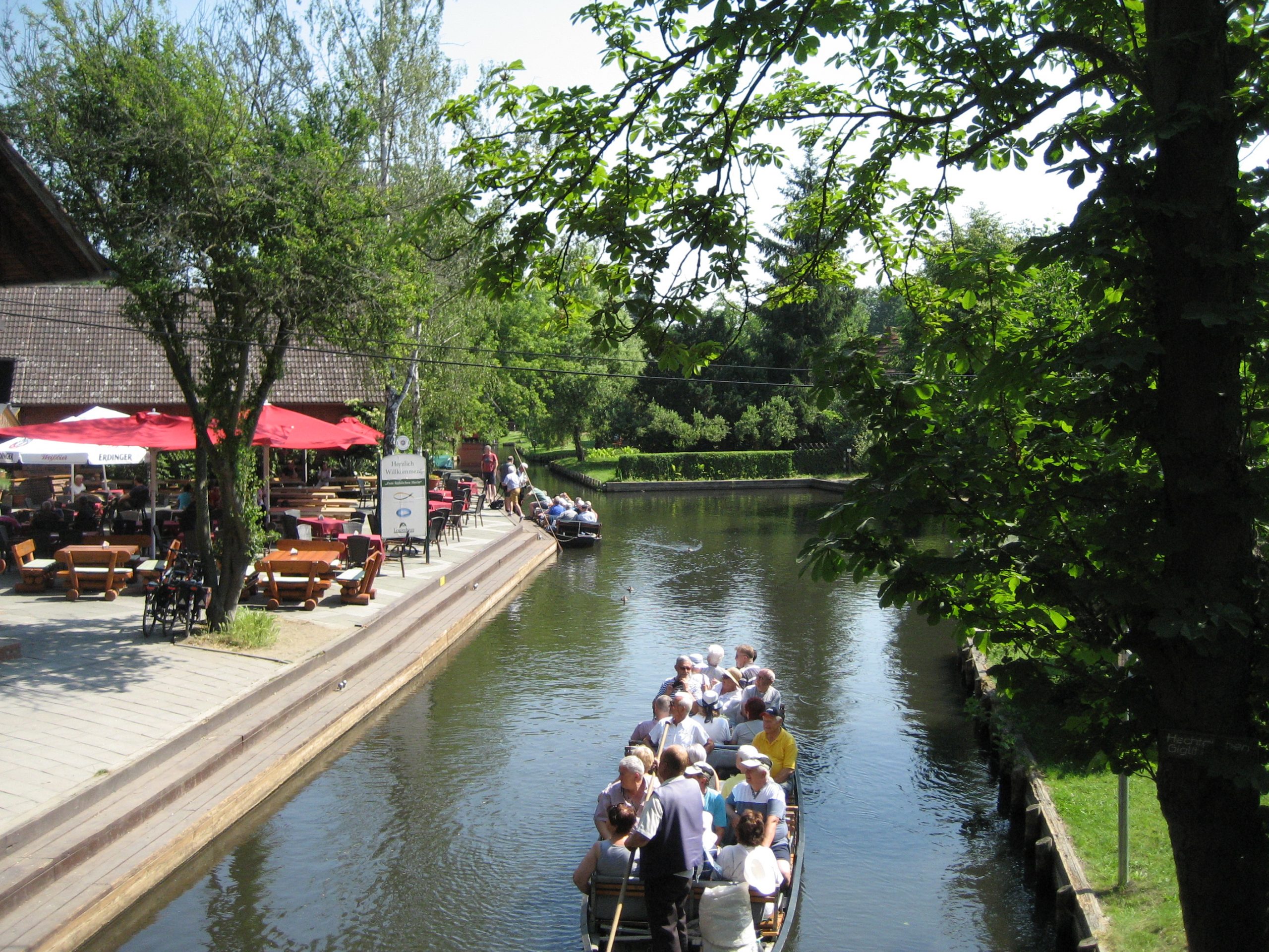 Der Ort besteht überwiegend aus Garten/Terassenwirtschaften, die von den unzähligen Spreekänen angesteuert werden und haufenweise Touris abladen. Auf dem Rückweg sahen wir die vielen Kähne von einer Brücke aus schon kommen. Sie fuhren wie auf einer Schnur aufgereiht durch die Spreearme.