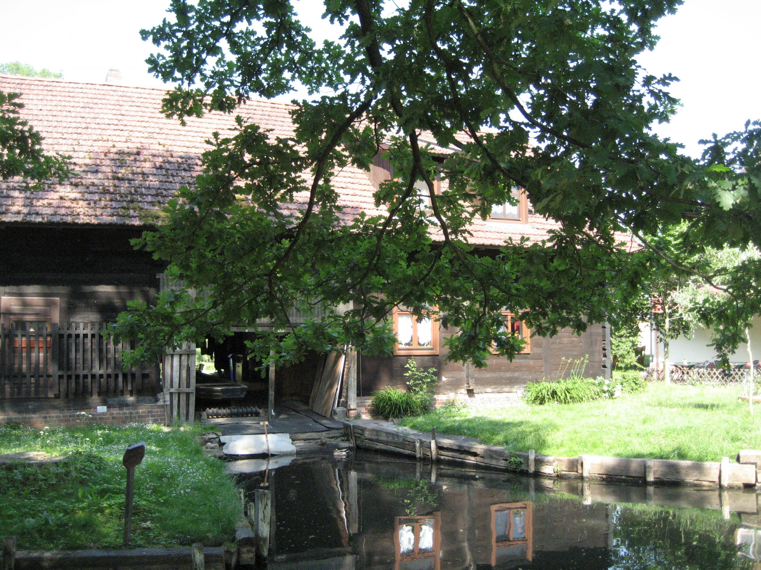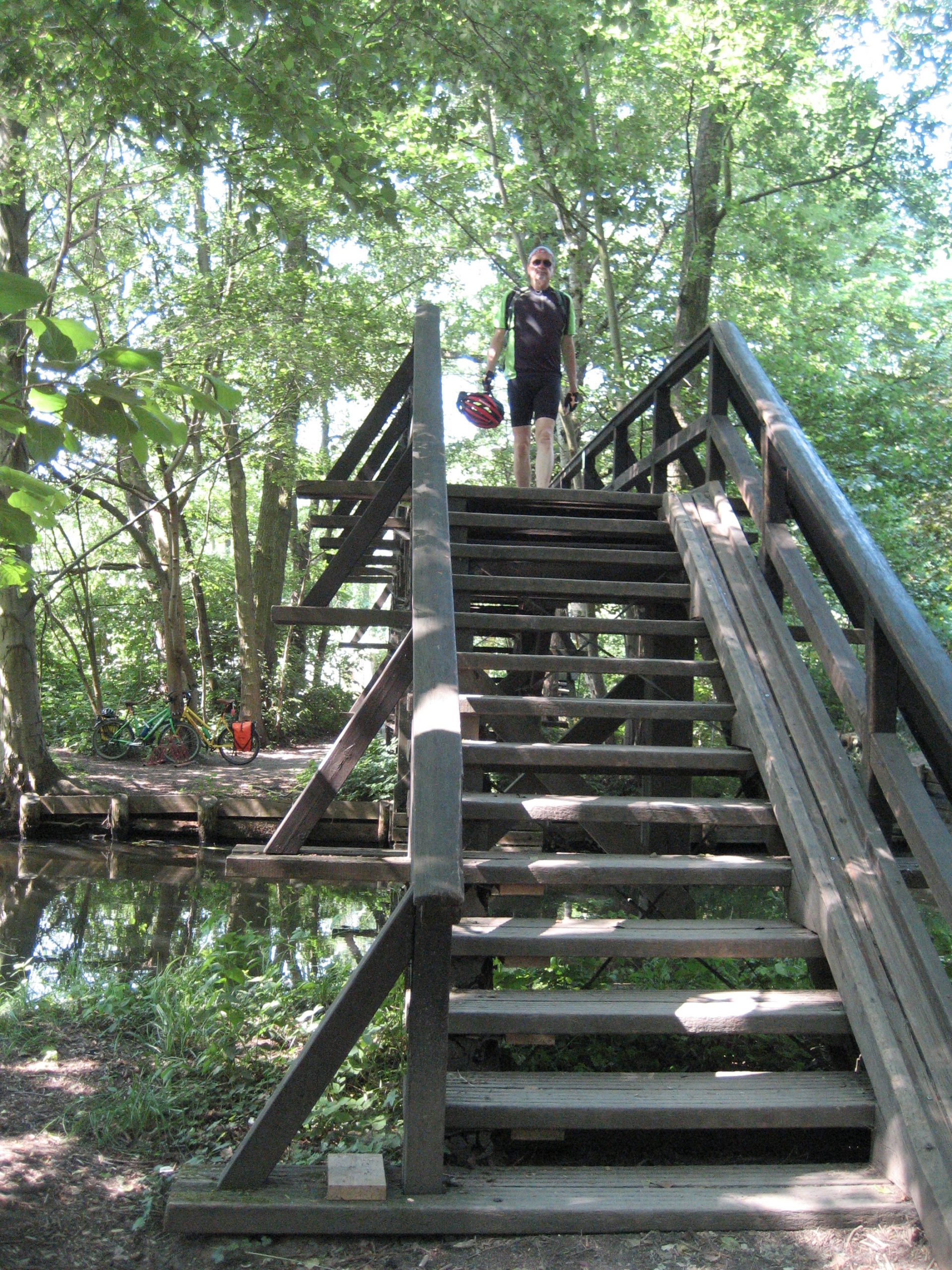 Wir liefen gehetzt von Mückenschwärmen zurück zu unseren Rädern und versuchten von nun an in Bewegung zu bleiben. Die Spreewaldmücken sind wenigstens nicht die schnellsten. So haben wir kaum mehr Mückenstiche bekommen, als wir nicht schon aus Prieros mitgebracht hatten. Vielleicht sind die Mücken auch nur bequem geworden, denn Fußgänger sind eine viel leichtere Beute und hier gibt es reichlich Fußgänger. Ohne die Mücken wäre die Strecke traumhaft gewesen. So war sie faszinierend schön. Ständig fuhren wir über kleine Holzbrücken und passierten auf diese Art unzählige Spreearme. Der dichte, Urwald ähnliche Wald in Kombination mit dem Wasser schafften ein tolles Klima bei der irren Hitze dieses Tages.