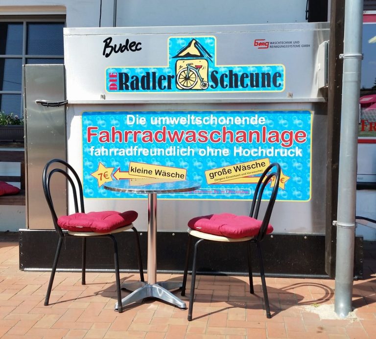 Erstmalig haben wir hier eine Waschanlage für Fahrräder gesehen. Zu diesem Zeitpunkt brauchten wir sie aber noch nicht. Aber drei Wochen später, nach der Ostseeradtour, hätte ich meinem Rad bestimmt so eine Wäsche gegönnt.