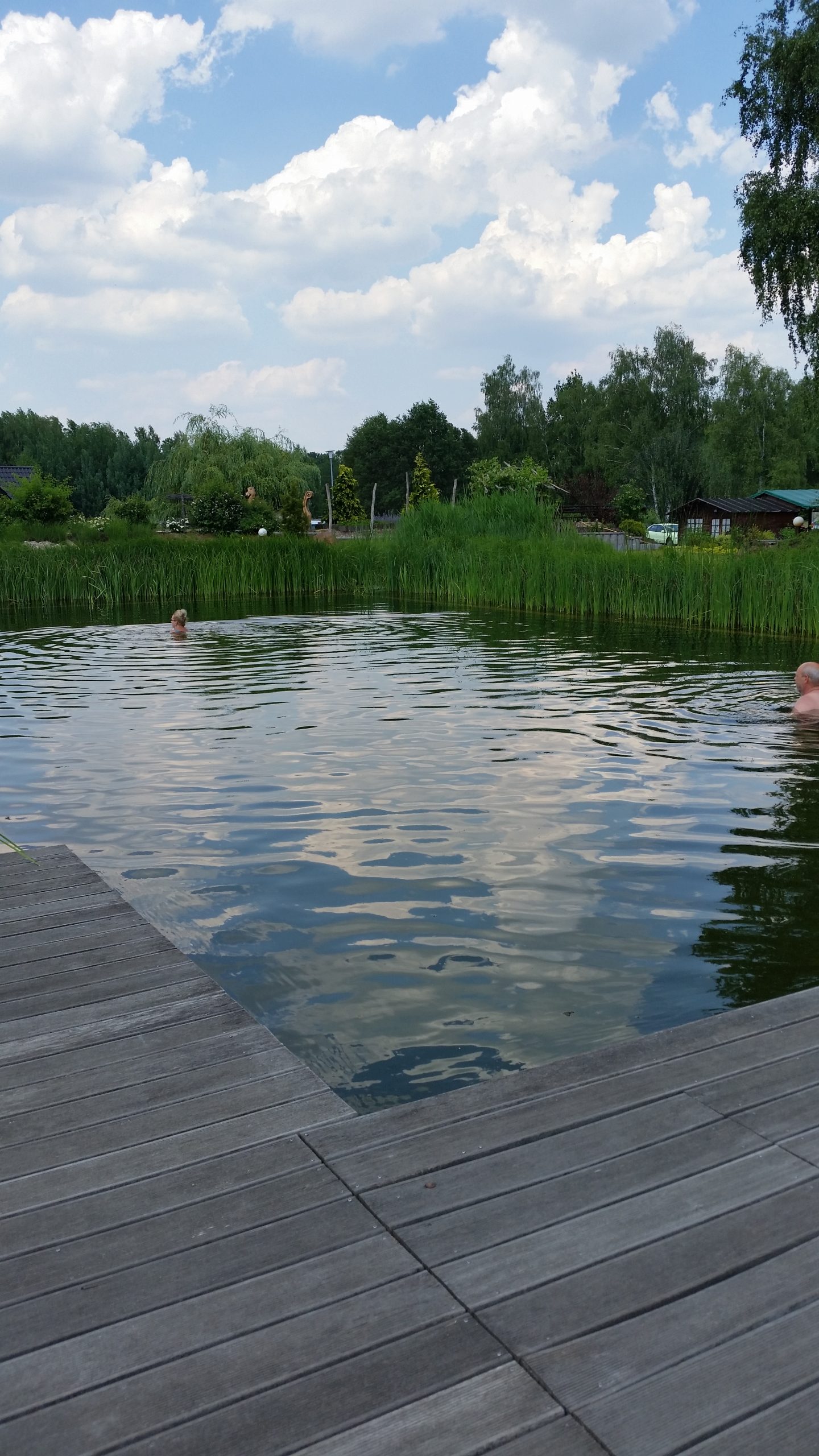 In Lübben machten wir eine Pause am Marktplatz. Brachen aber recht bald wieder auf, da ein Windchen aufzog und ich Angst hatte, dass das angekündigte Wetter Norberts Haut durchnässten könnte. Von da an ging es auf dem Dahmeradweg nach Norden. Wir fuhren an vielen großen Seen vorbei und wären auch gern baden gegangen. Leider waren diese Seen bei näherem Betrachten nicht mehr einladend zum Baden. Es waren eben nur recht flache Fischteiche mit reichlich Entengrütze und ähnlichem Zeugs.