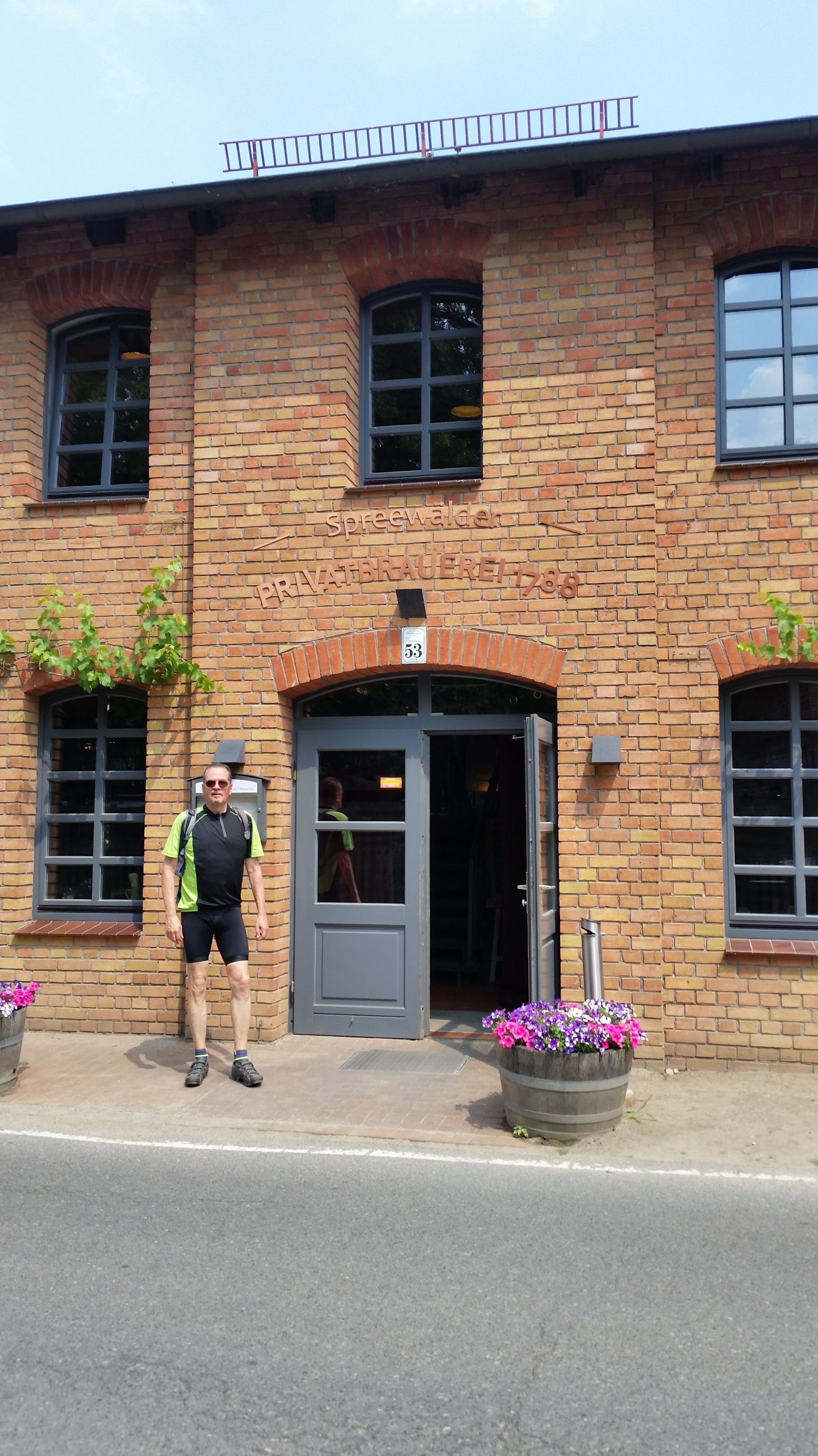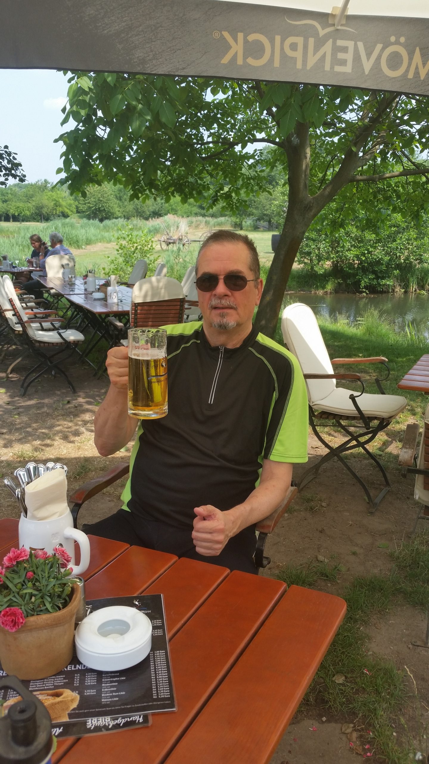 In Schlepzig standen wir auch bald vor unserem Hotel,konnten zwar noch nicht das Zimmer beziehen, aber wenigstens Gepäck und Räder verstauen. In dem Brauereigasthof mit schönem Außenbereich – alles gehört zum Hotel – konnten wir die Zeit bis das Zimmer bezugsfertig war, gut verbringen.