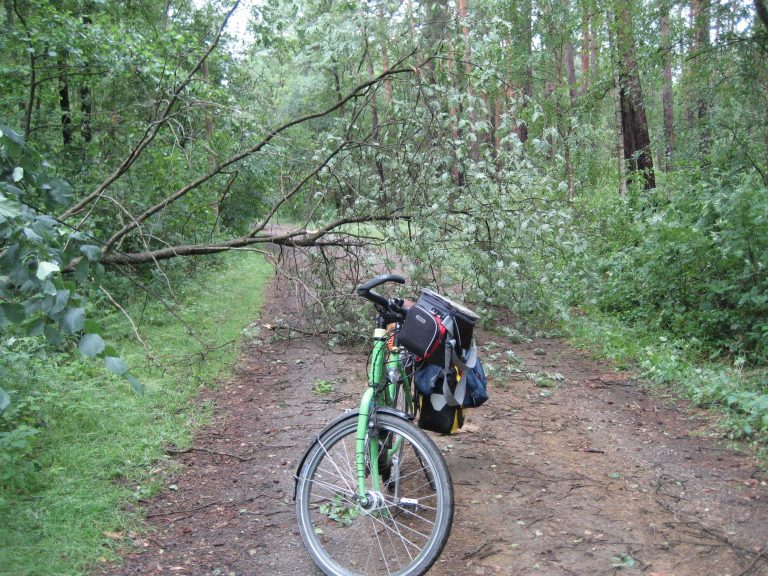 Auf dieser Strecke sahen wir doch einiges, was das Unwetter vom Vortag angerichtet hatte. Unter anderem versperrte uns ein umgekippter Baum den Weg. Norbert zerrte so gut es ging, den Baum aus dem Weg. Ich schob die Räder nacheinander an Ästen und Blattwerk vorbei.