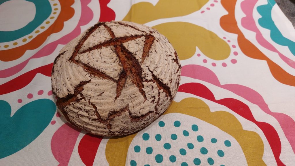 Den Brotlaib in ein Gärkörbchen geben, das vorher mit Roggenschrot oder Gries bestäubt wurde. Dort nochmals abgedeckt 45 Minuten gehen lassen.