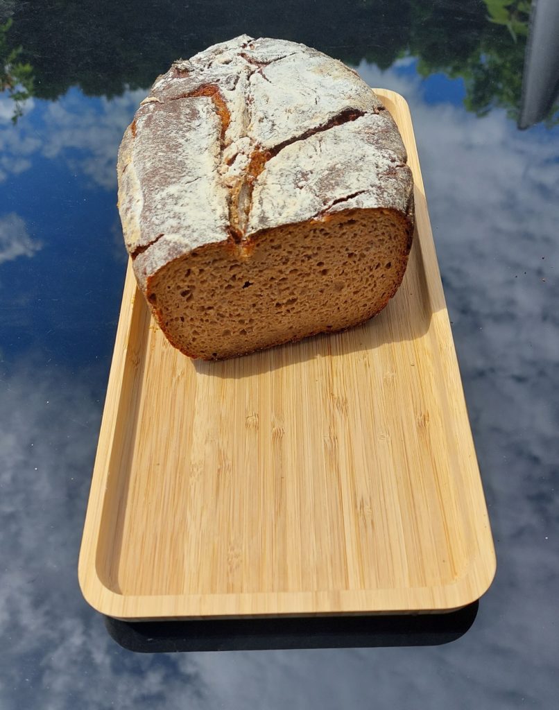 Blech mit Wasser im Ofen mit erhitzen. Die Brotform einschieben. Nach 10 Minuten Wasserblech entnehmen und Dampf ablassen. Das Brot weitere 45 Minuten mit fallender Temperatur backen. Dabei die Temperatur stetig (etwa alle 10 bis 15 Minuten) bis auf 210°C reduzieren.