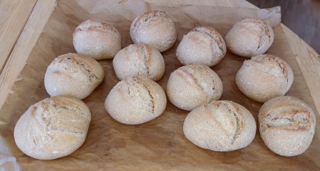 600 g gemahlener Weizen 600 g Weizenmehl Typ 1050 900 ml Wasser 4 – 5 g Hefe 24 g Salz (gehäufter TL) evtl. 2 -3 EL Backmalz