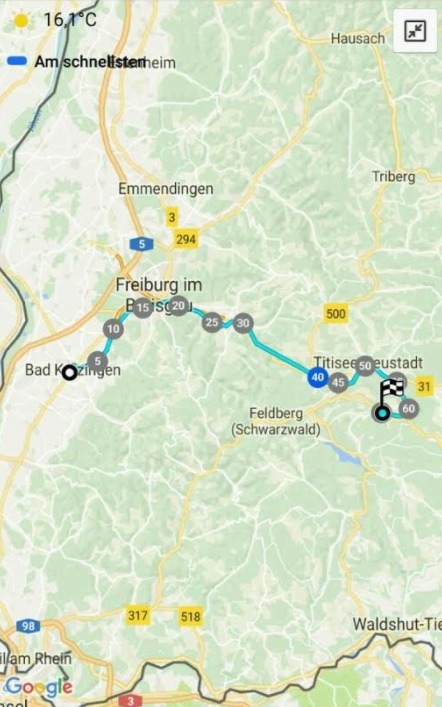 Nach 22,5 km sind wir in Bad Krozingen gelandet. Das Hotel ist echt super. Frisch geduscht sieht die Welt schon wieder viel entspannter aus. Die Fahrt war ziemlich anstrengend . Da ich keine Lust hatte neben der Kandertalbahn bis nach Kandern zu fahren und dann über einen Buckel , haben wir uns entschieden, vorher hoch zu fahren. Wir hofften dadurch weniger Steigung zu haben, als wenn wir bis nach Kandern durch gefahren wären und dann von da aus über den Buckel nach Schliengen.