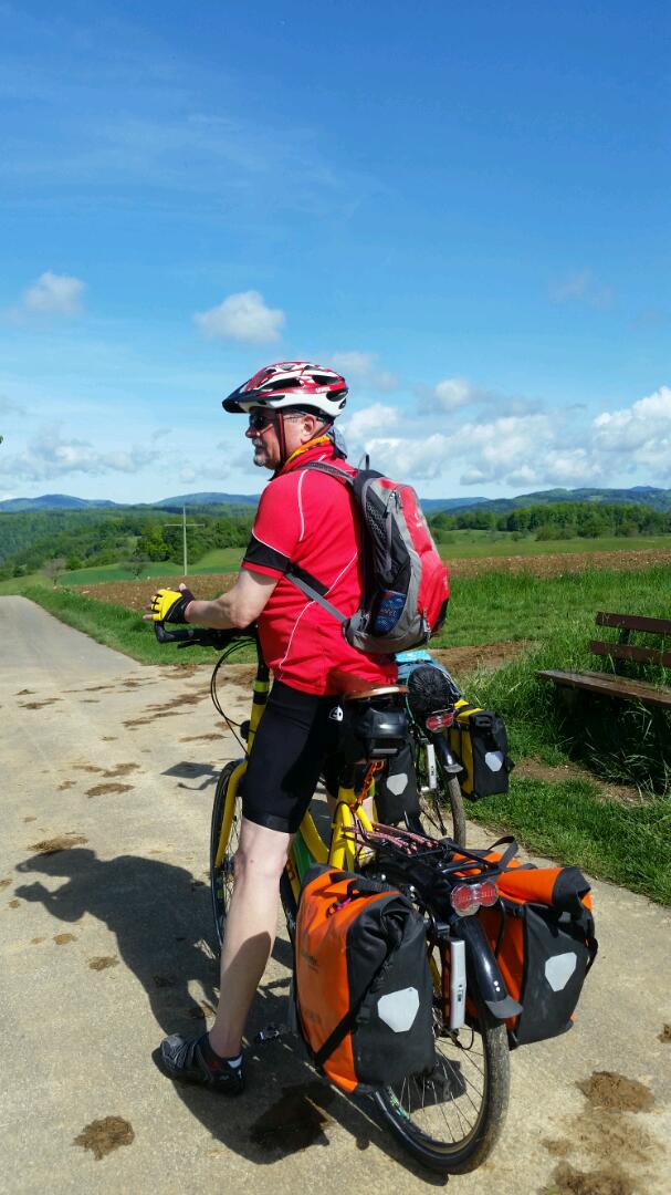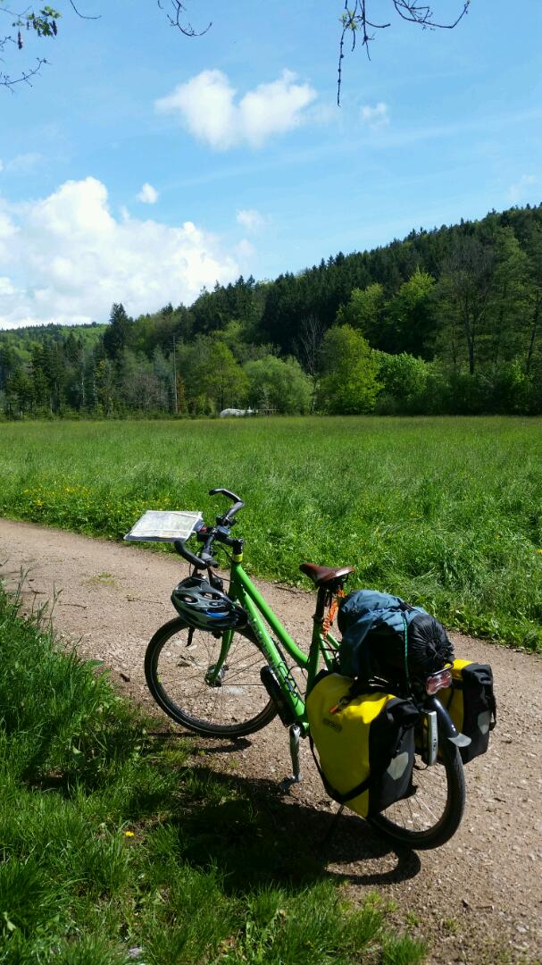 Weiter ging es zunächst mit mehreren kleinen Anstiegen. Schließlich waren wir an der Stelle, von der an es fast nur noch abwärts ging. Teilweise führte uns die Wegweisung über eine weniger befahrene Straße, teilweise aber auch abseits jeglichen Autoverkehrs. Der Belag war bis Stühlingen fast ausschließlich asphaltiert. Da konnten die Räder natürlich gut laufen . Ab und zu mal mussten wir Pause machen, um unsere Hände auszuschütten. Jetzt waren nämlich nicht die Beine gefragt, sondern die Hand und Armmuskulatur beim Bremsen.