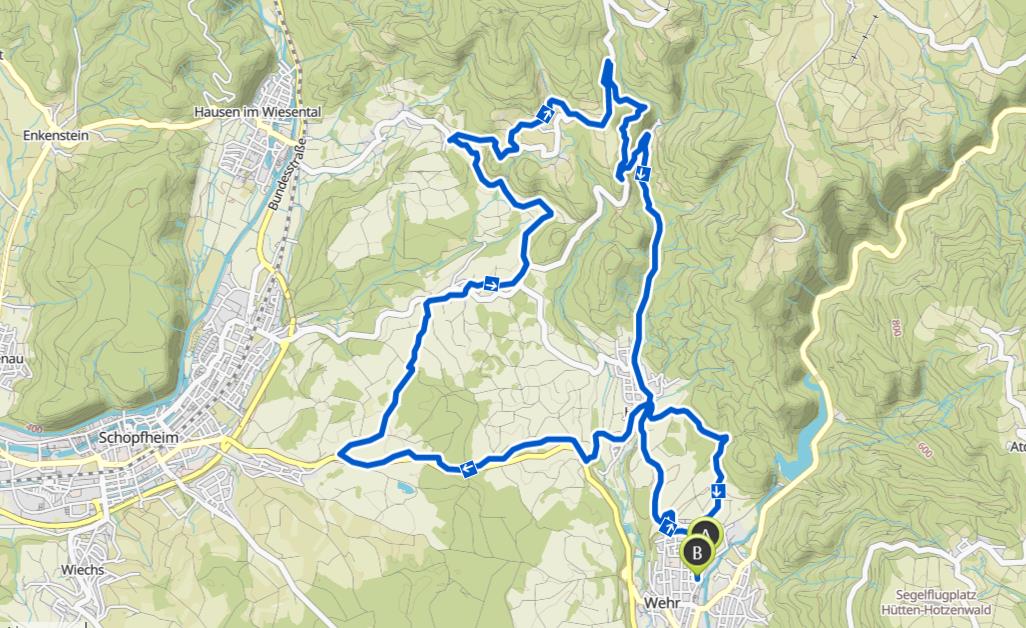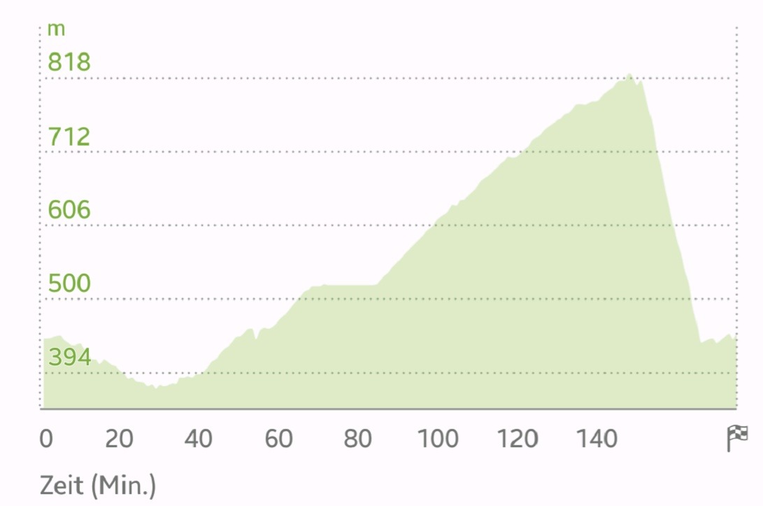 Heute möchte ich es mir einmal geben. Ich bin gerade auf der ersten Bank Abzweig Grünnebach (nach unten geht es nach Brennet). Ich will aber weiter nach oben fahren und von oben wieder nach Wehr kommen. Der Karte nach kommen jetzt diverse mittlere Steigungsabschnitte und zwei heftige. Darüber will ich mir jetzt noch gar keine Gedanken machen. Wenn ich die Strecke schaffe, geht’s nur noch bergab. Da werden dann wieder die Hände und die Konzentration trainiert.Nach 2:02 h war ich endlich oben. Bin bis dahin 20 km gefahren. Insgesamt habe ich mein Rad allerdings auf insgesamt ca. 500 m geschoben. Lieber wäre mir ein Bank zum Ausruhen gewesen. Die gab es nicht. Also beschloss ich 2 mal zu Fuß zu gehen. Die Steigungen waren einfach zu heftig für mich. Bis zu 4,8 km/h kann ich auf dem Rad bleiben. Wird es noch langsamer, würde ich wahrscheinlich mit Rad umkippen. Laufen ist dann richtig entspannend.